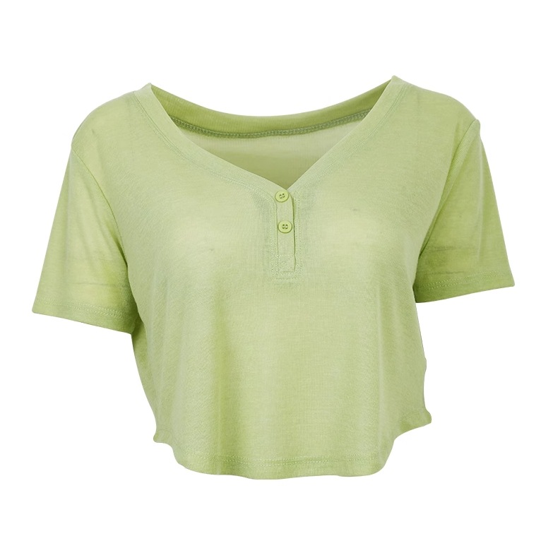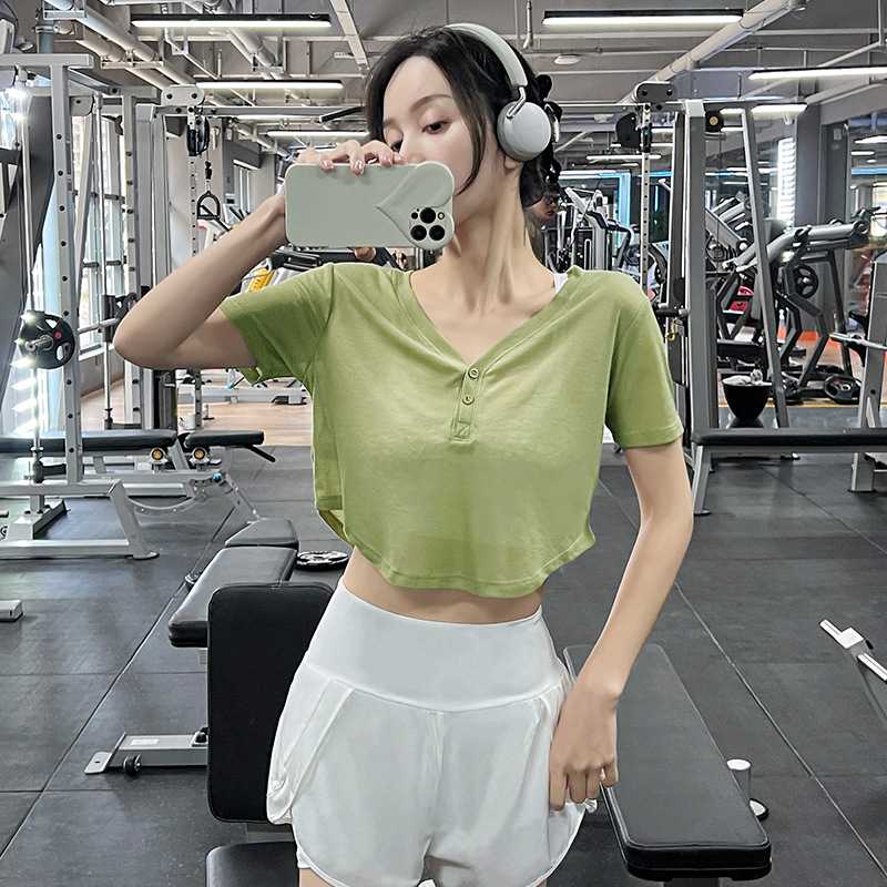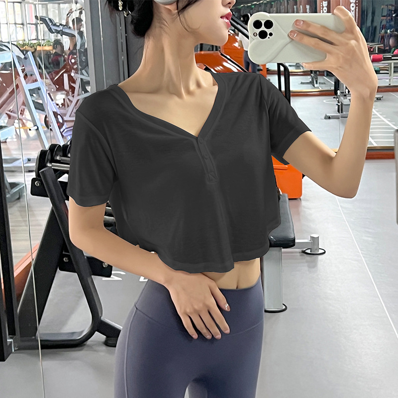 宽松瑜伽服女罩衫薄款运动短袖夏季跑步训练短款健身t恤深V性感