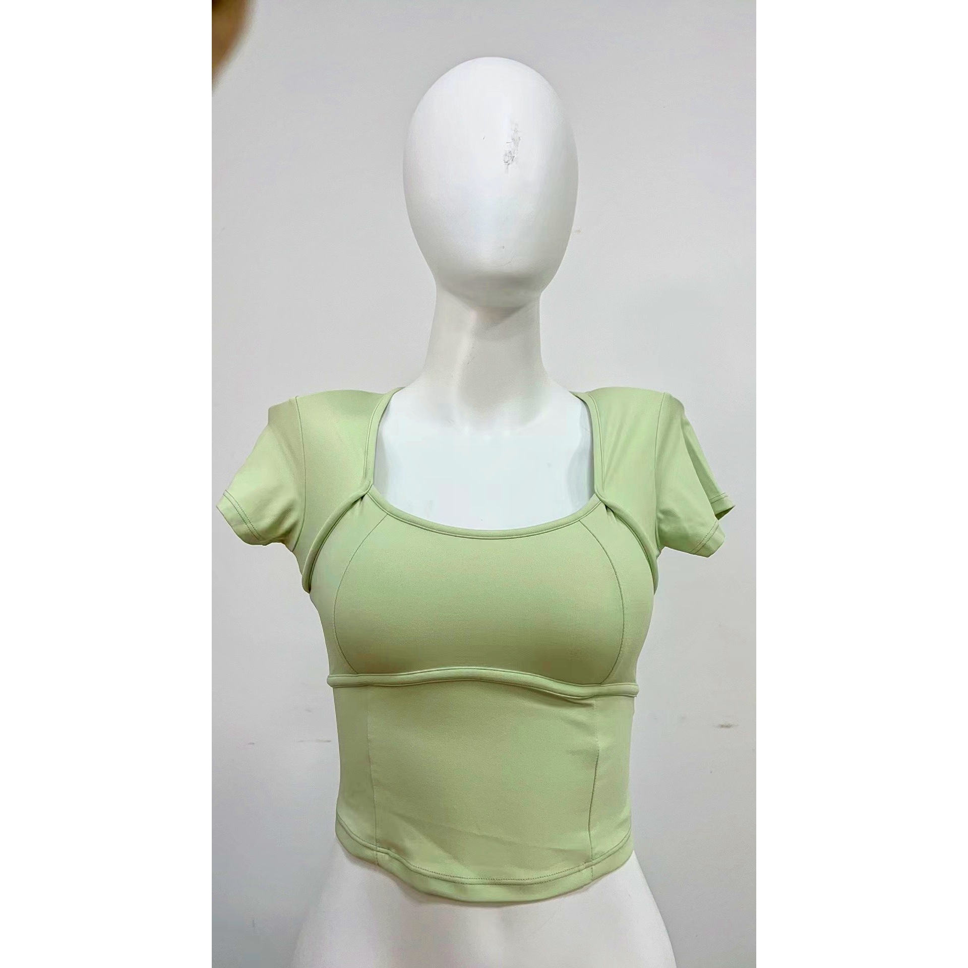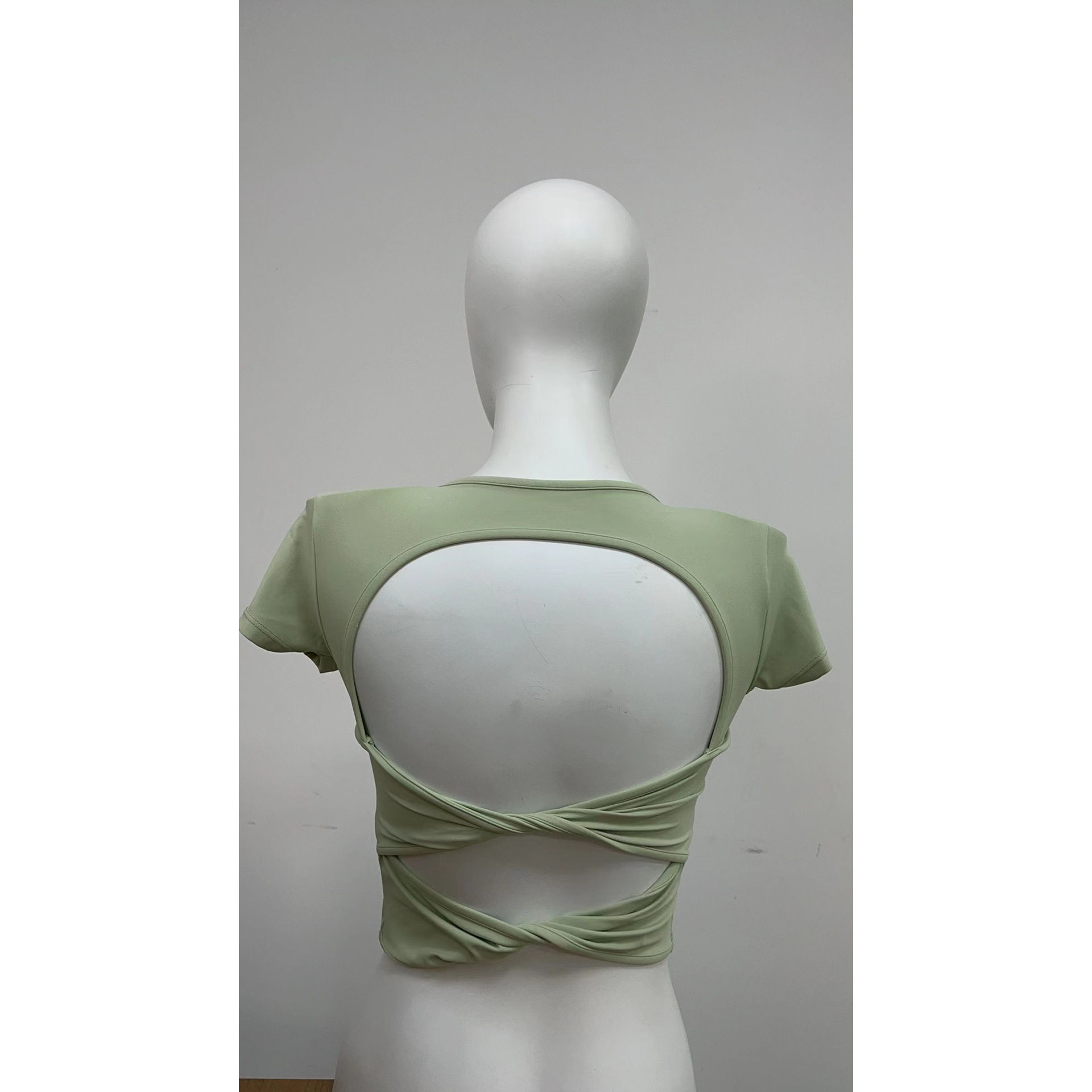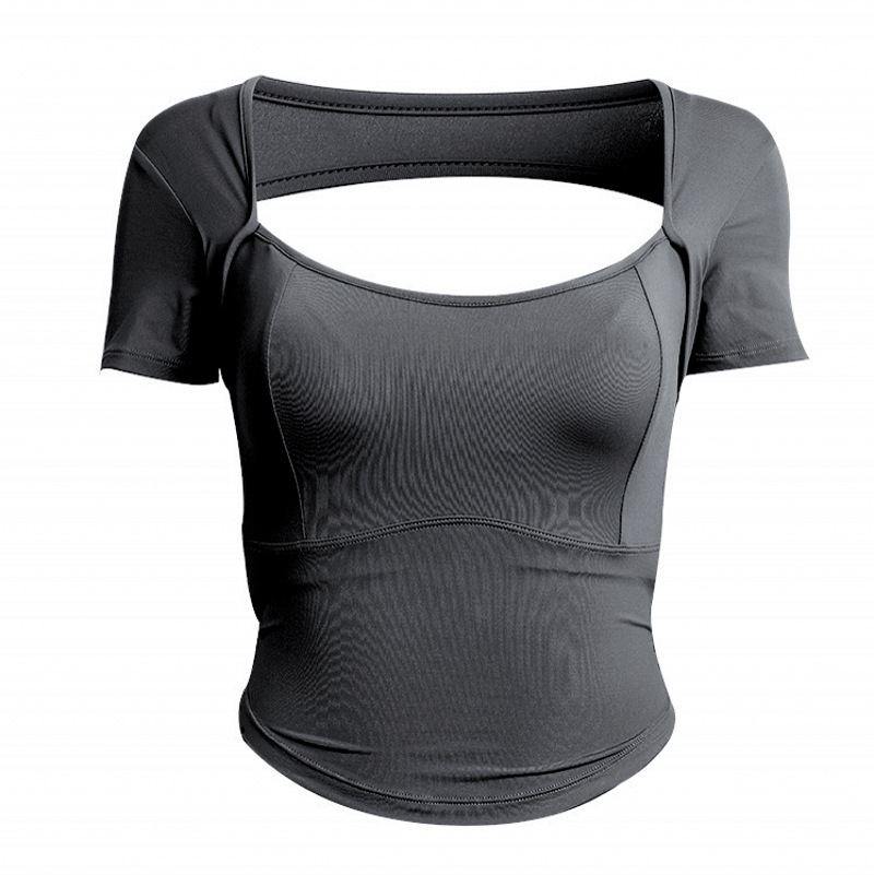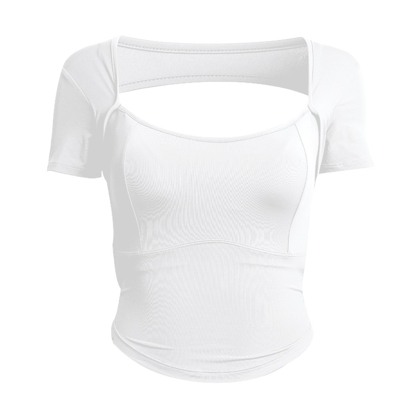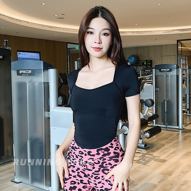 欧美一体式固定胸垫运动上衣女短袖露背紧身瑜伽服健身衣镂空扭结