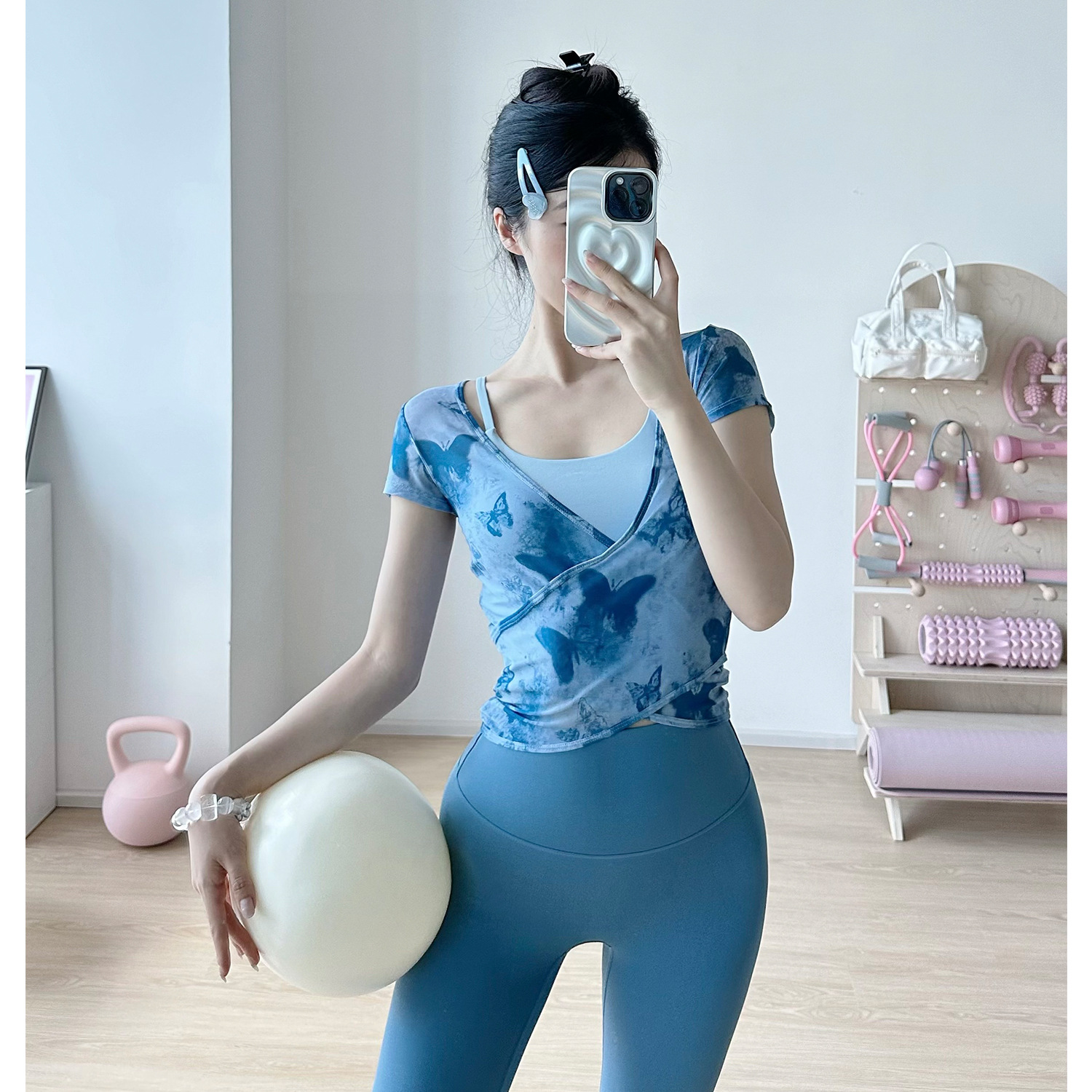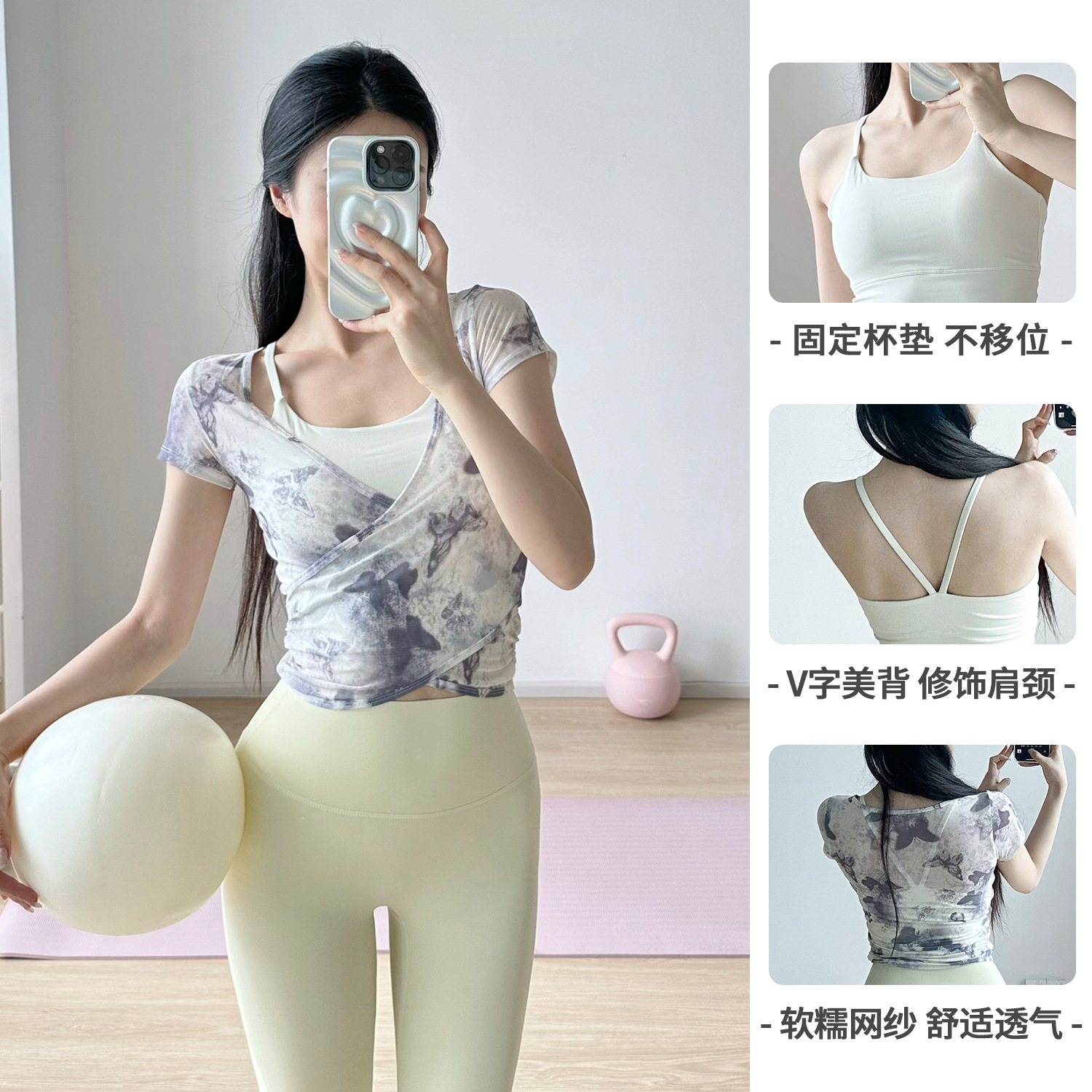 跨境国风蝴蝶印花真两件套轻薄半透明网纱罩衣瑜伽服吊带健身背心