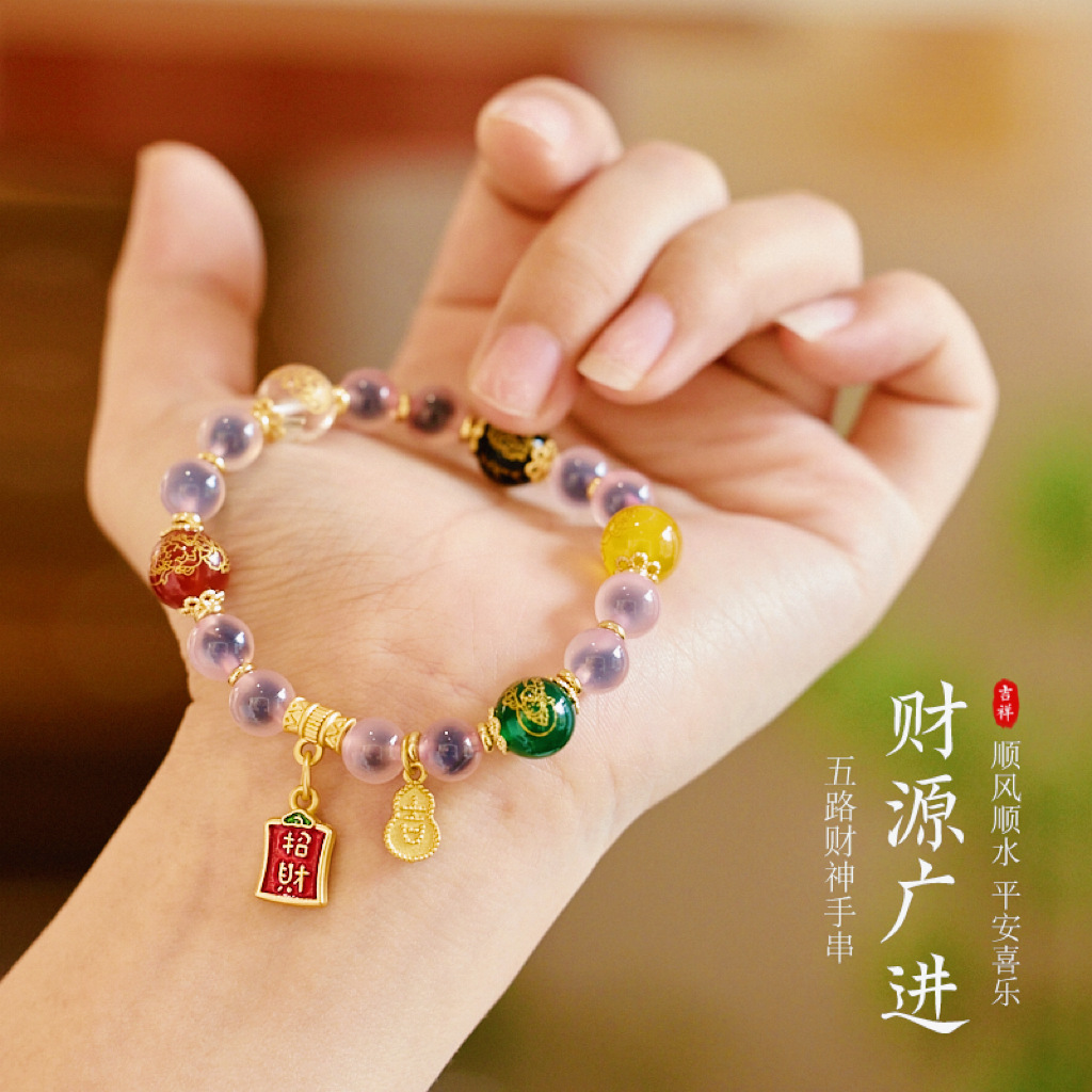 天然粉溏心玛瑙手串五路财神半糖溏心聚宝盆手链礼物