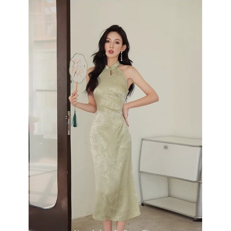 新中式温婉无袖挂脖改良旗袍连衣裙女复古提花盘扣开叉中长裙夏装