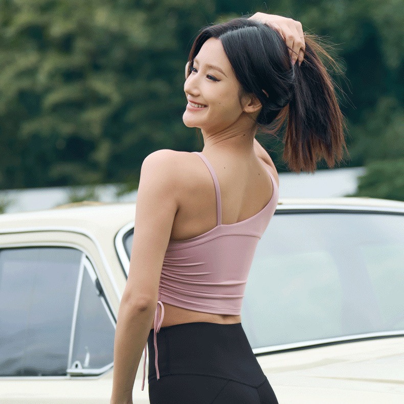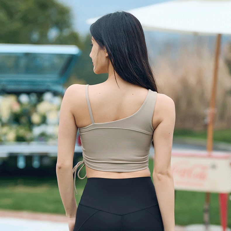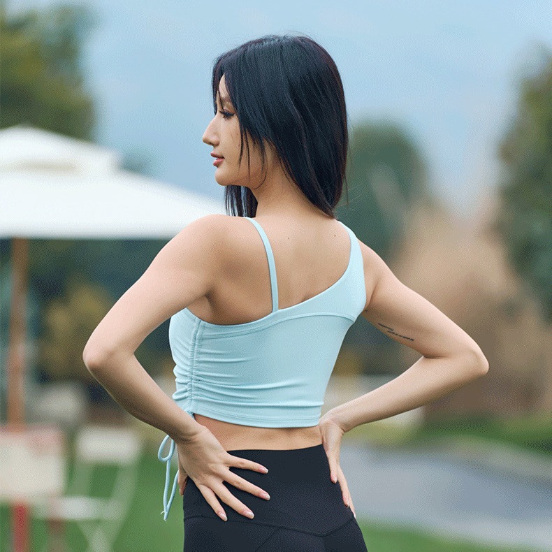 新欧美健身运动内衣固定胸垫瑜伽服单肩不对称抽褶背心女外贸
