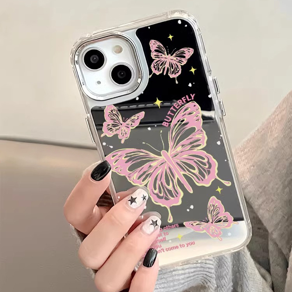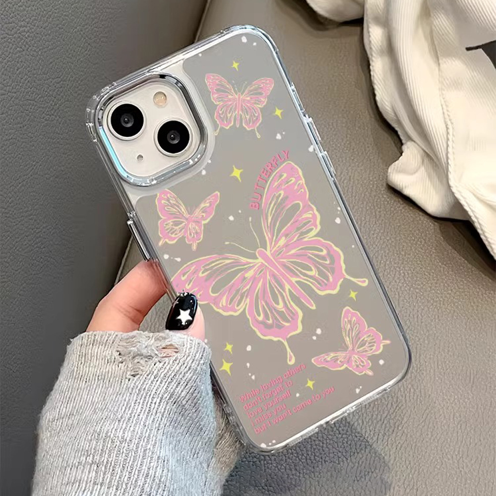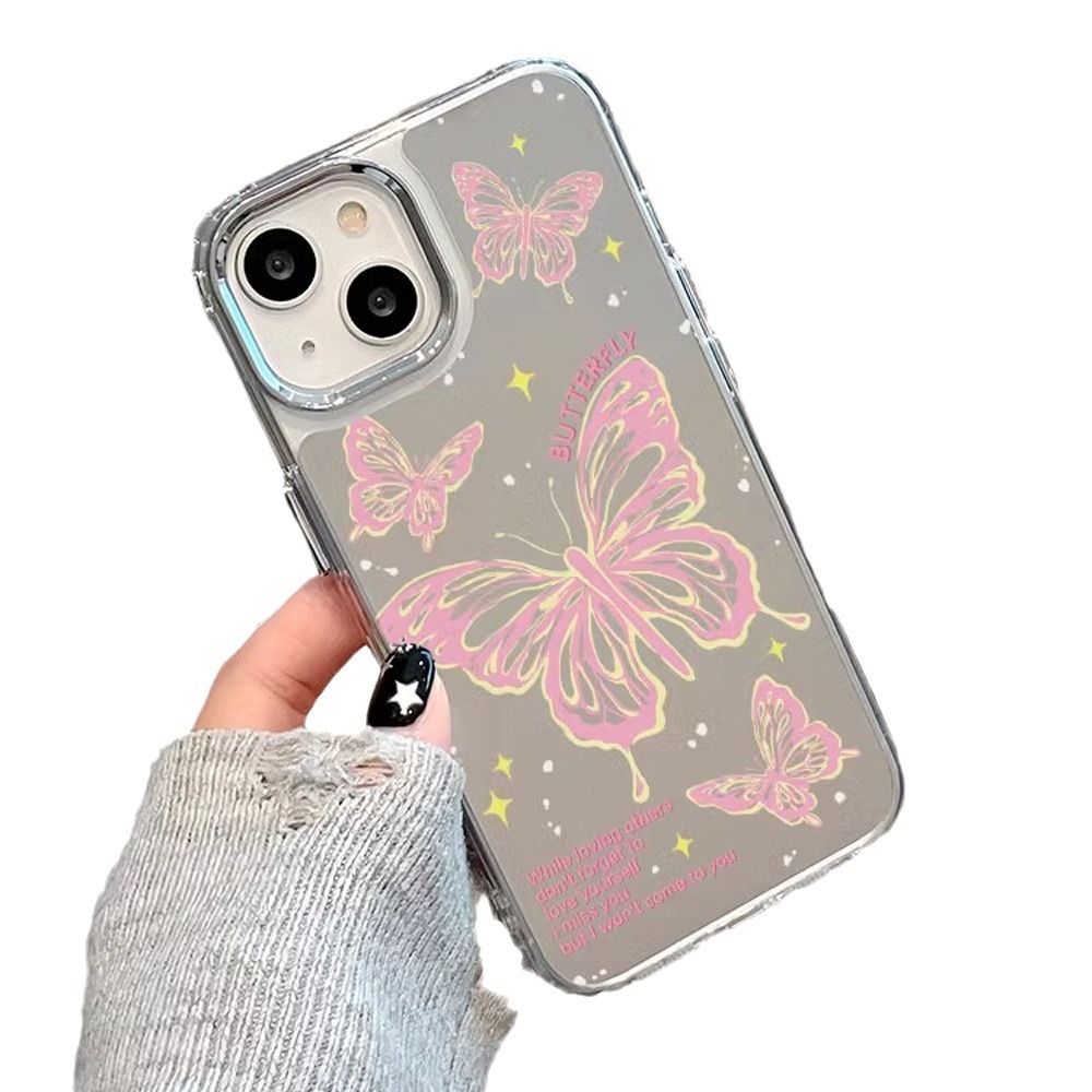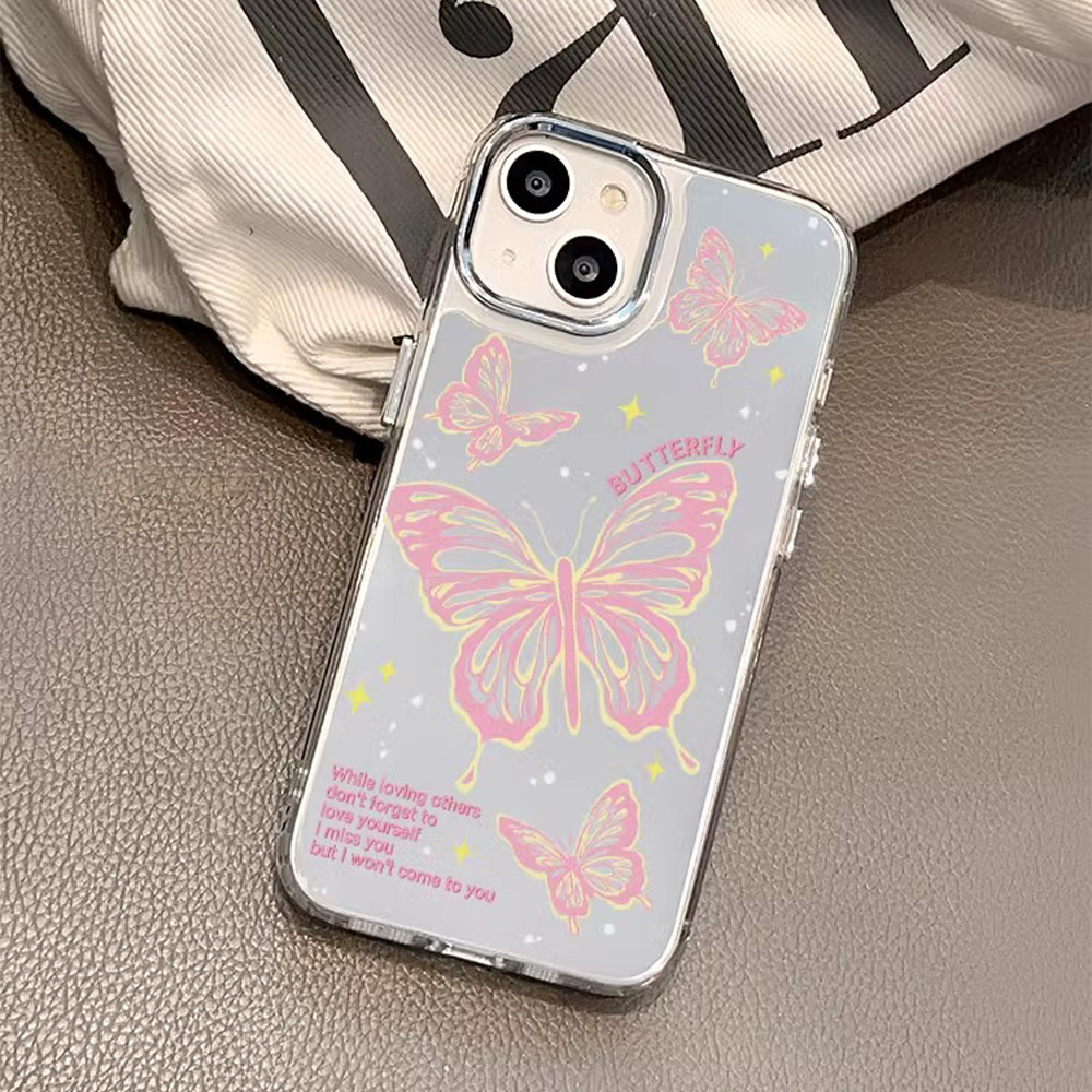 新款日韩ins粉色蝴蝶适用苹果14Pro Max手机壳15镜面iPhone13电镀