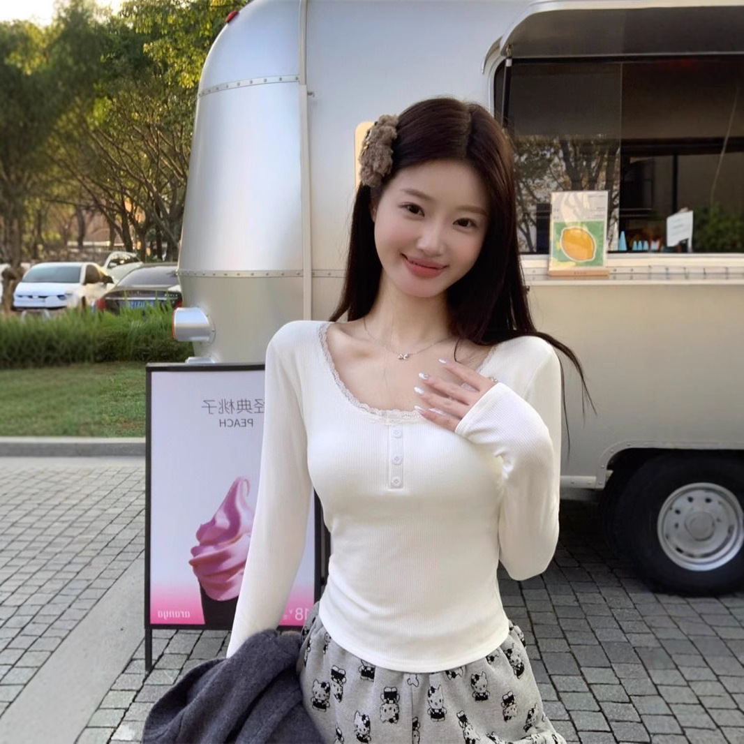 法式温柔蕾丝花边打底衫女秋冬新款纯欲U领修身显瘦内搭长袖上衣