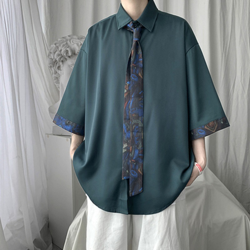 夏季冰丝领带短袖衬衫男设计感小众高级感痞帅港风拼接五分袖衬衣