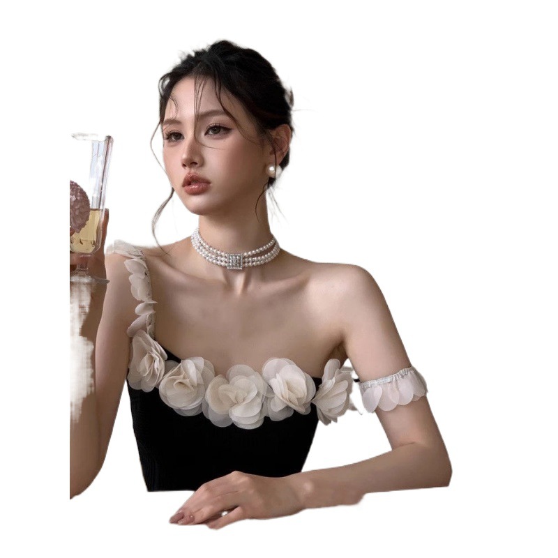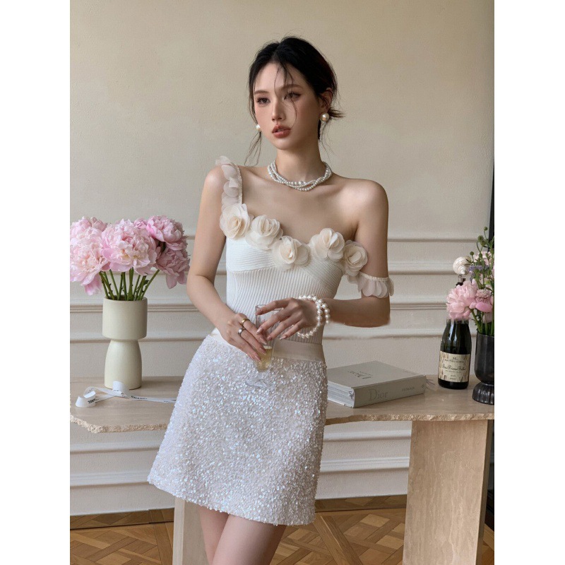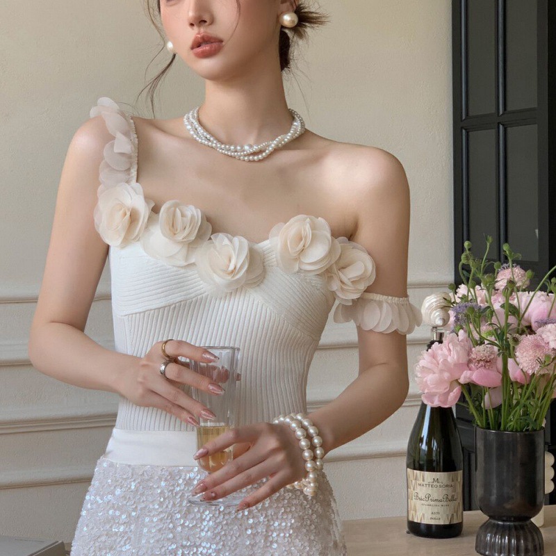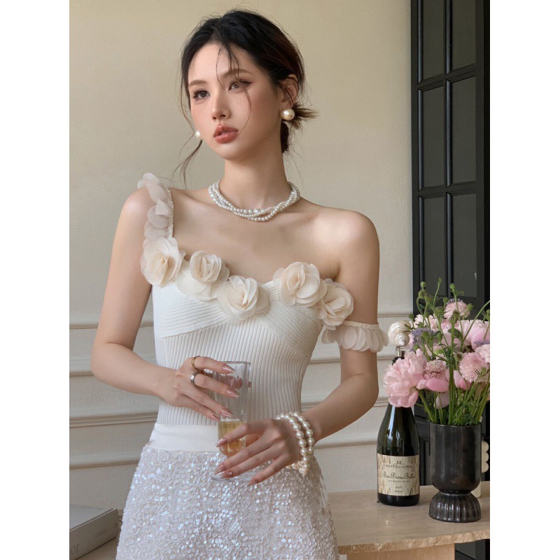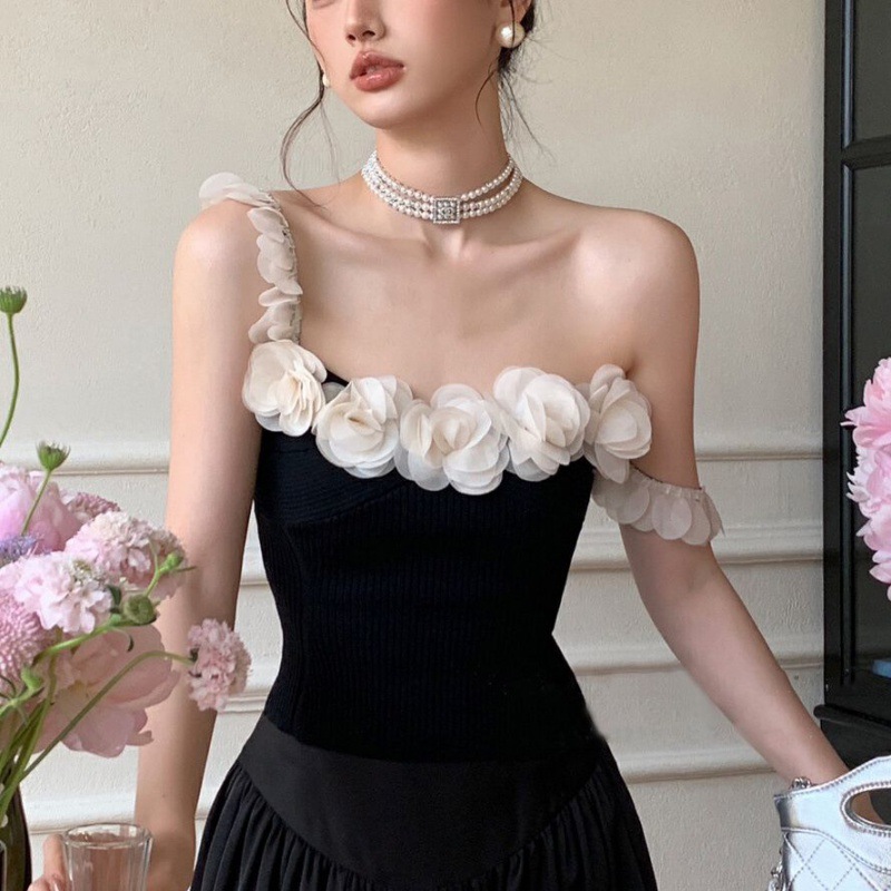 夏季新款法式气质优雅纯欲风甜辣花瓣吊带针织背心短款上衣