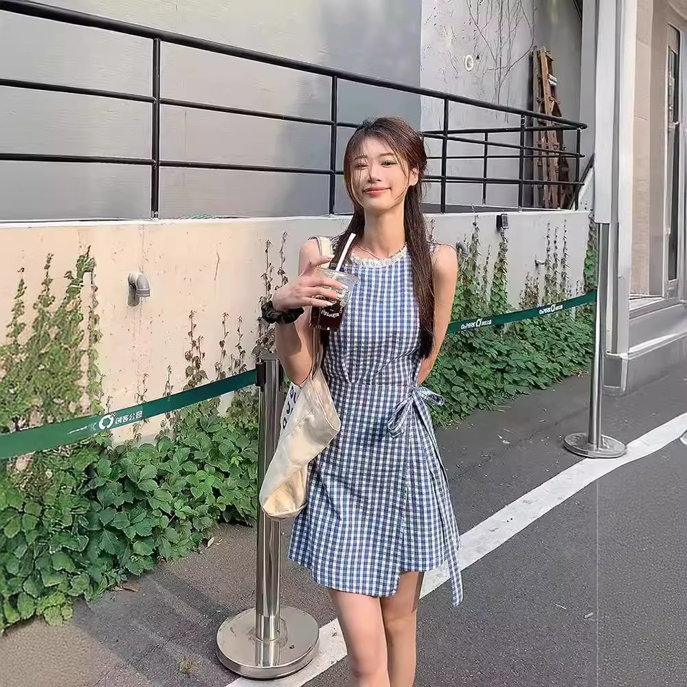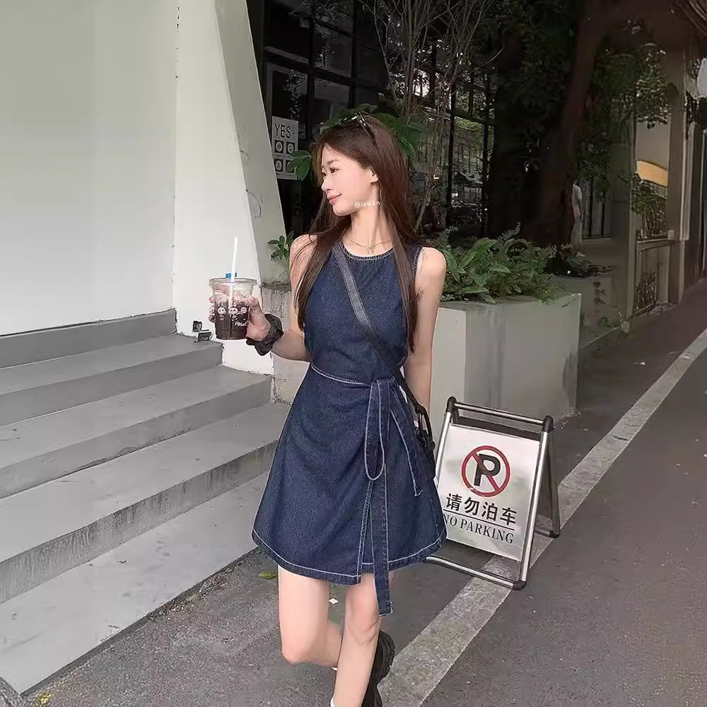 法式复古牛仔连衣裙女夏季设计感系带不规则背心裙小个子A字短裙