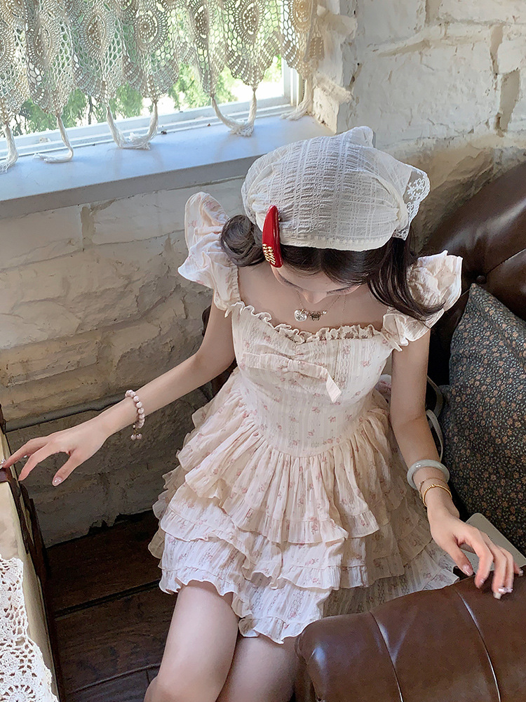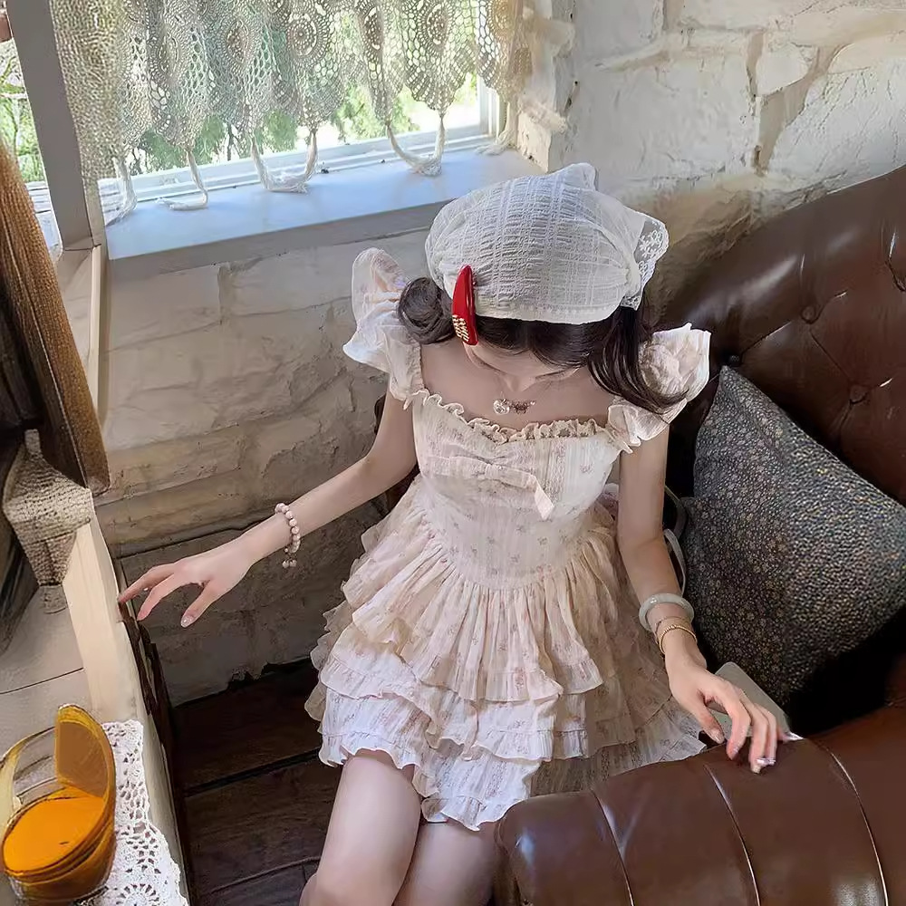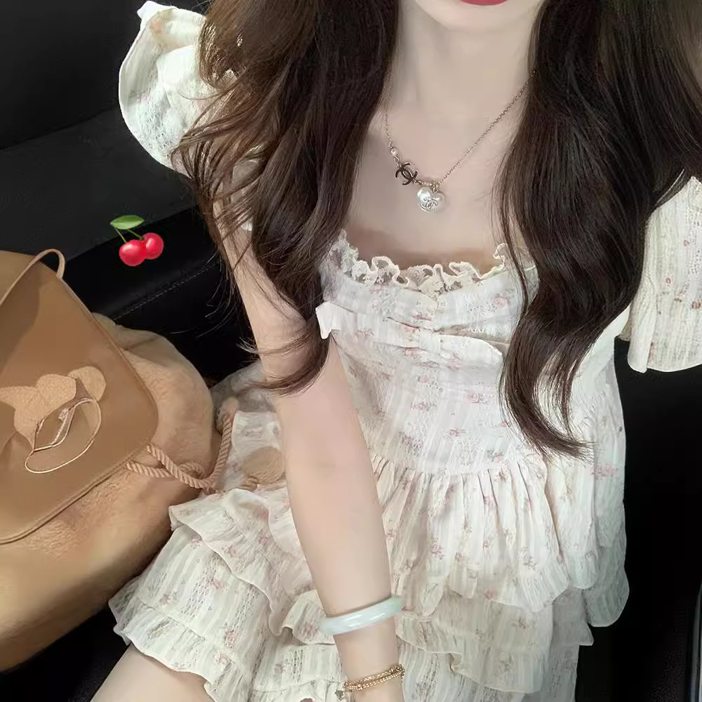 小飞袖碎花连衣裙女夏季新款气质收腰显瘦洋气设计感蓬蓬蛋糕裙子