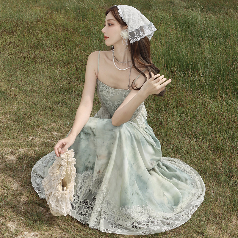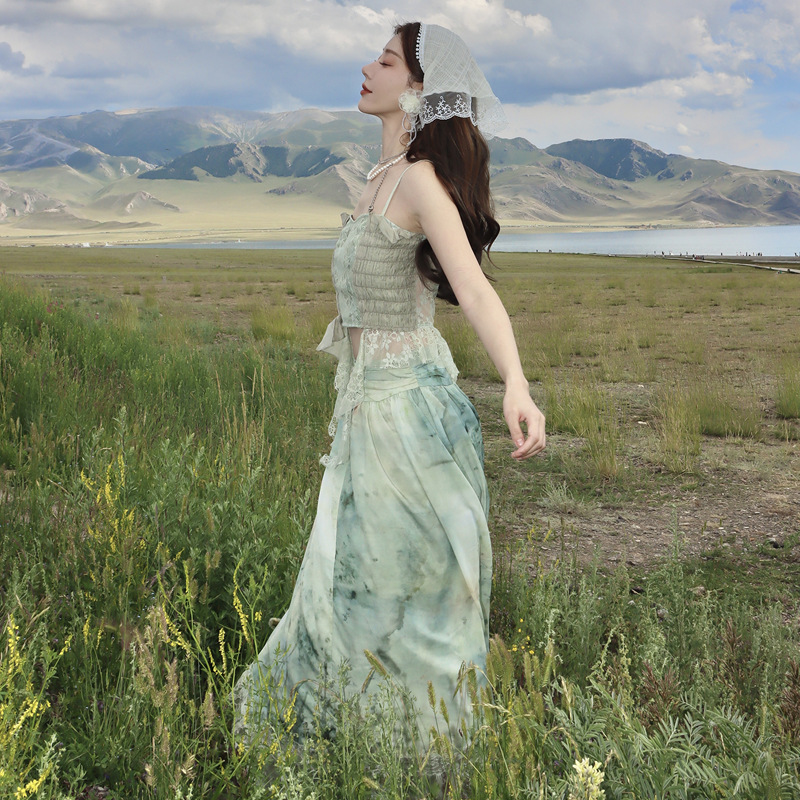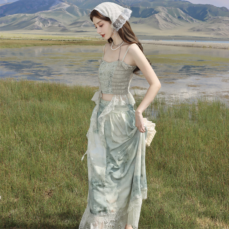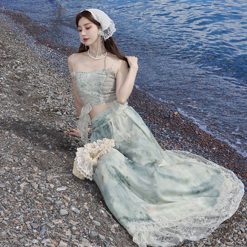 法式度假风套装女打揽抹胸吊带上衣+氛围感晕染蕾丝半身裙两件套