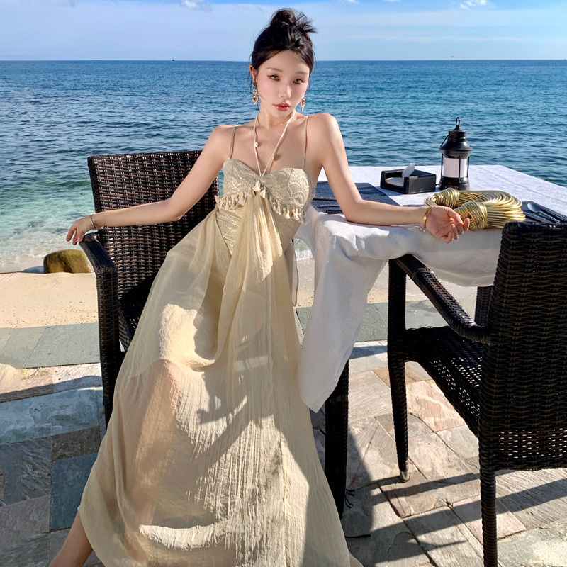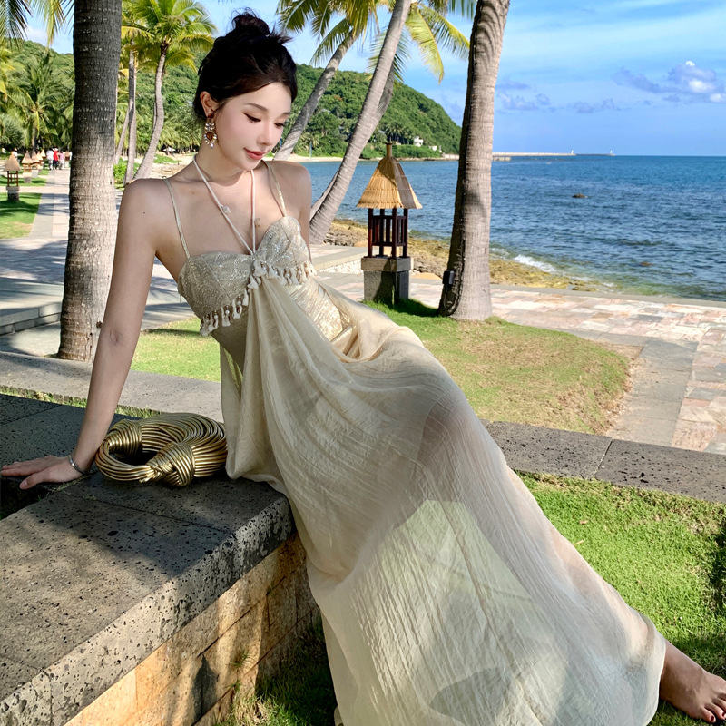 度假海边偏光贝壳挂脖收腰吊带鱼尾连衣裙适合海边拍照的裙子