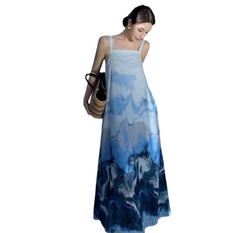 新中式复古水墨画晕染吊带连衣裙女夏季中国风气质海边度假沙滩裙