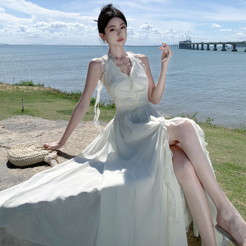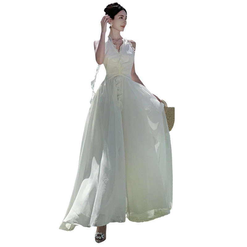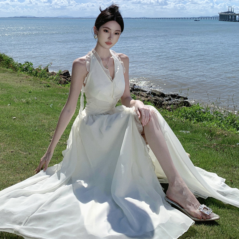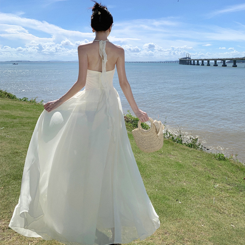 法式高级感超好看仙气质雪纺挂脖连衣裙仙女夏季海边度假风长裙子