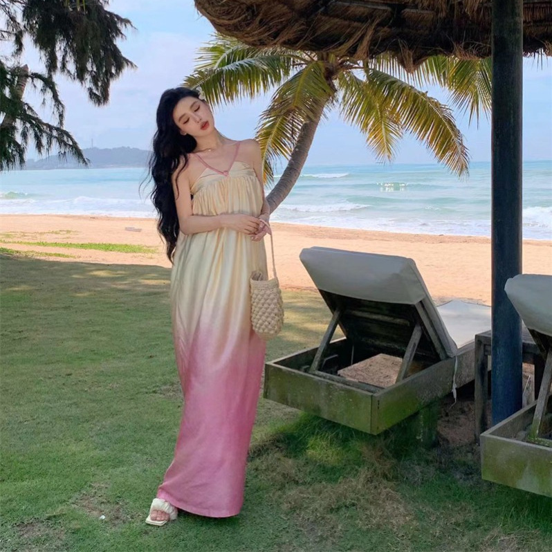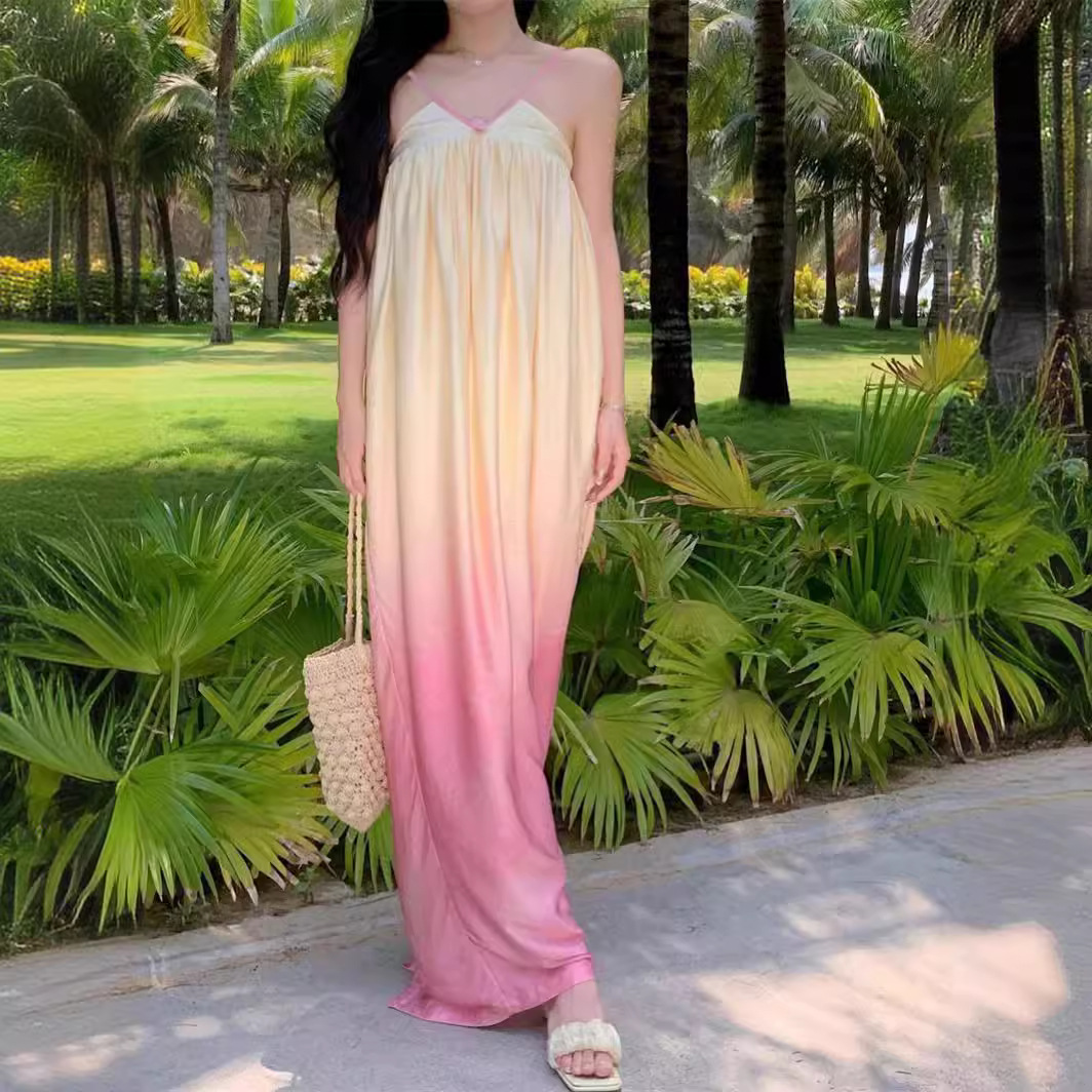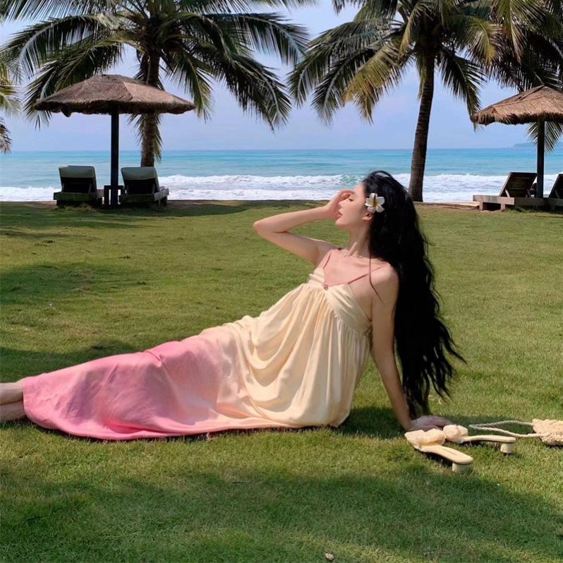 法式超仙海边郁金香黄粉渐变色V领纯欲氛围感度假花苞吊带连衣裙