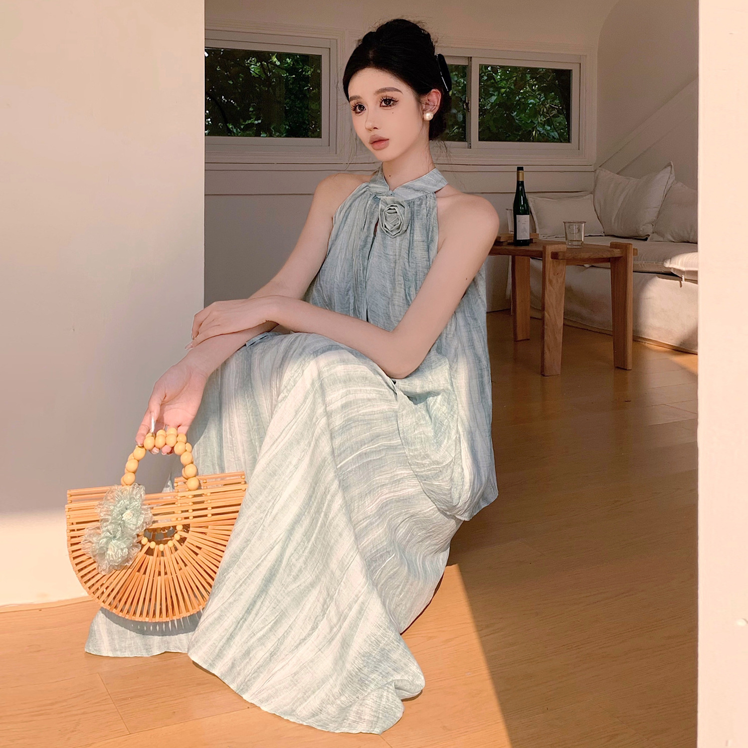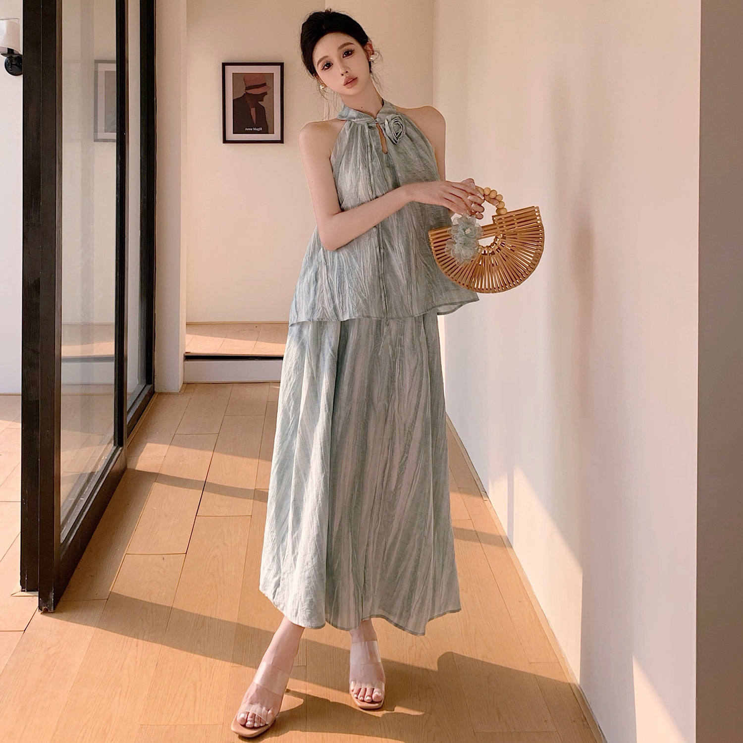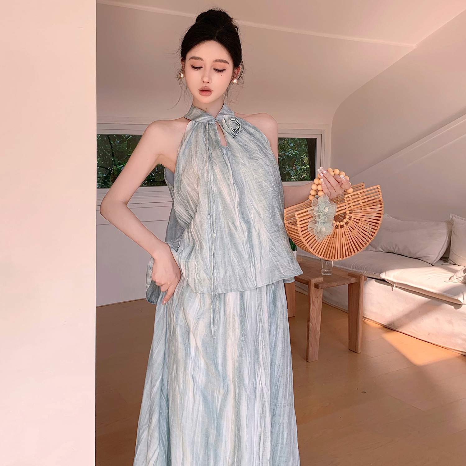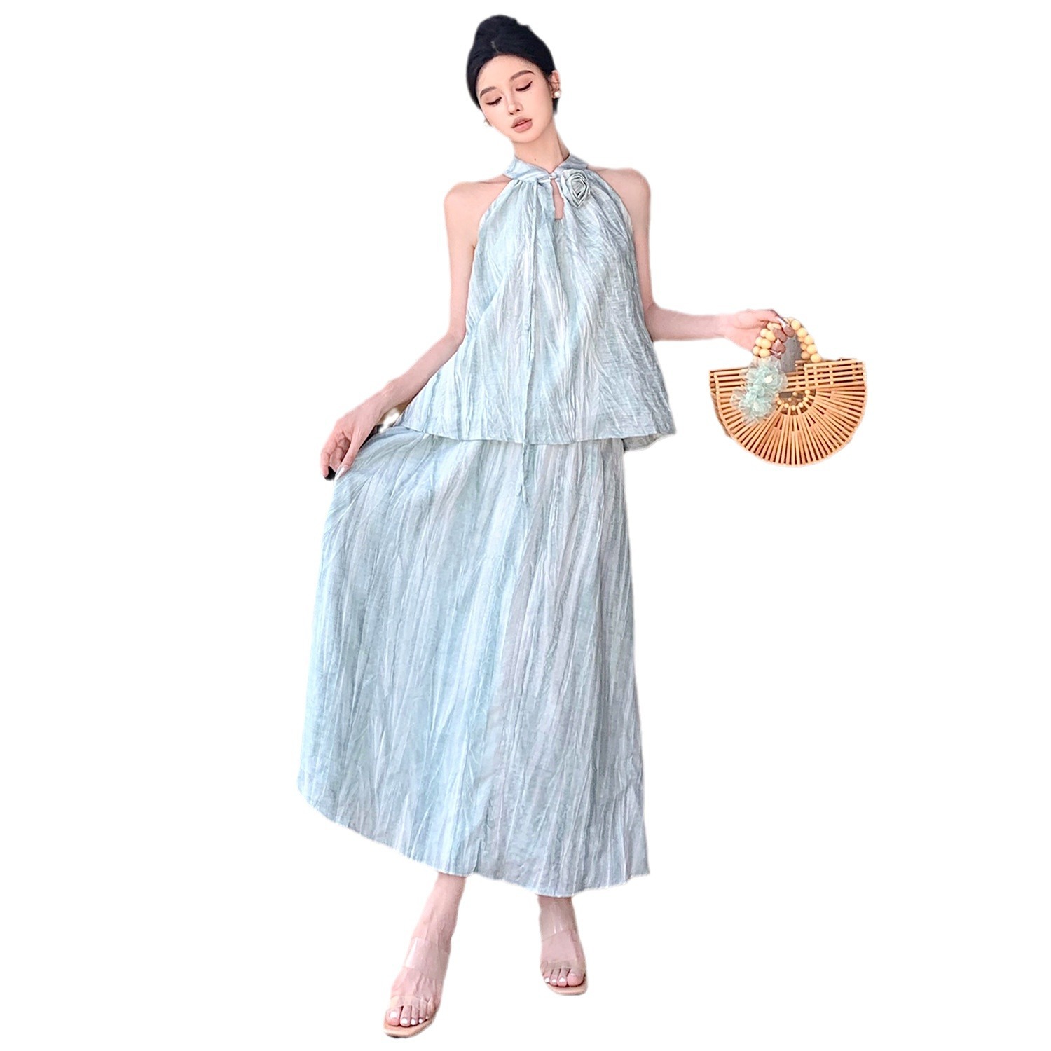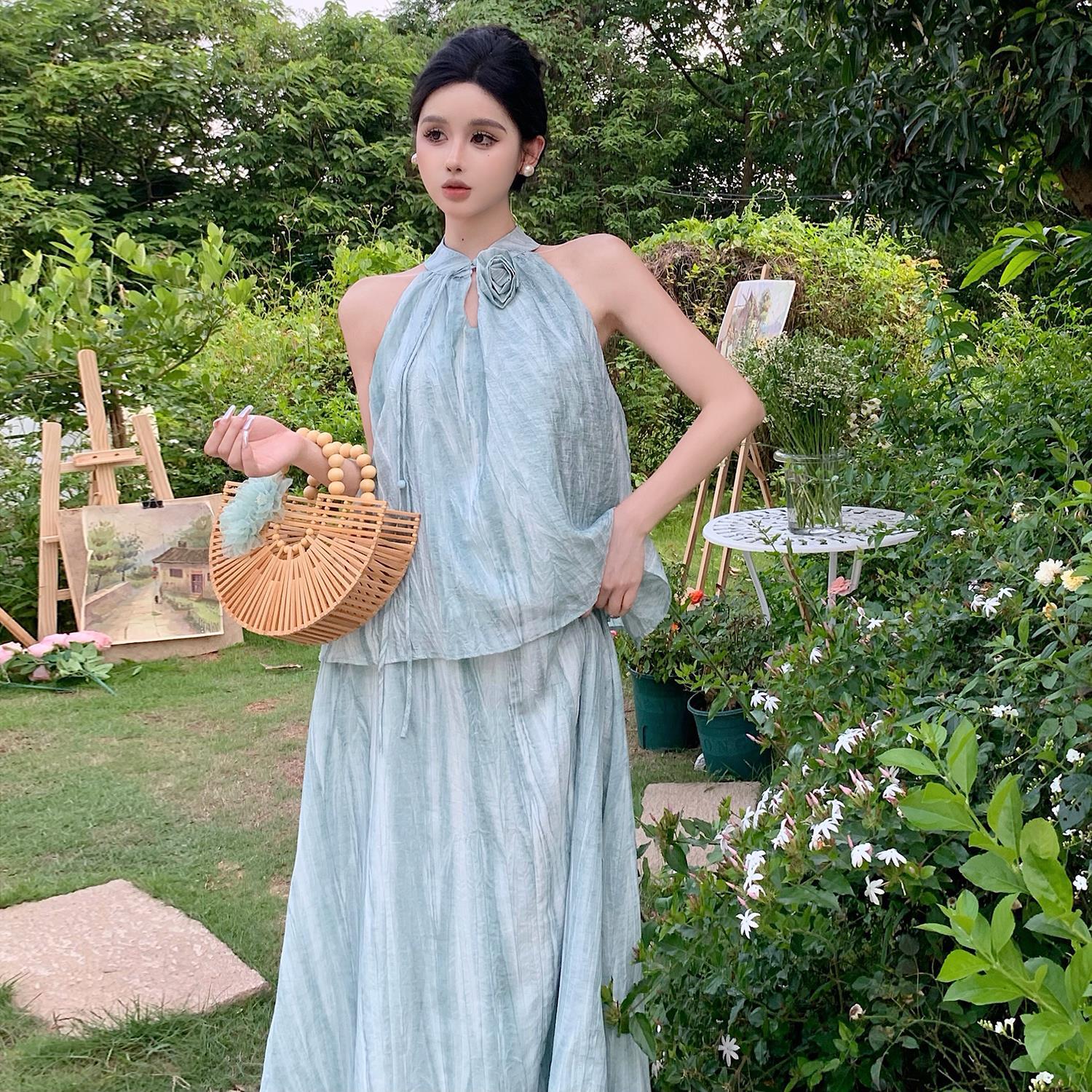 度假风两件套蓝色无袖挂脖连衣裙女夏季法式海边拍照气质背心裙子