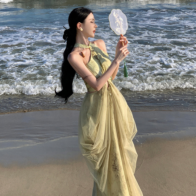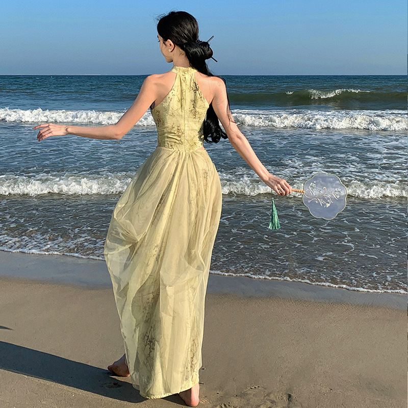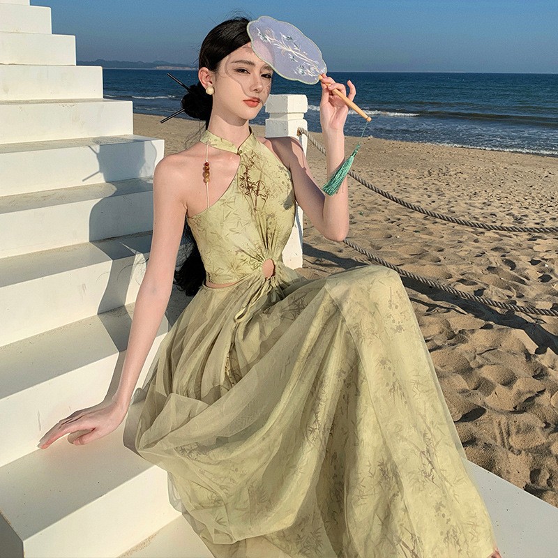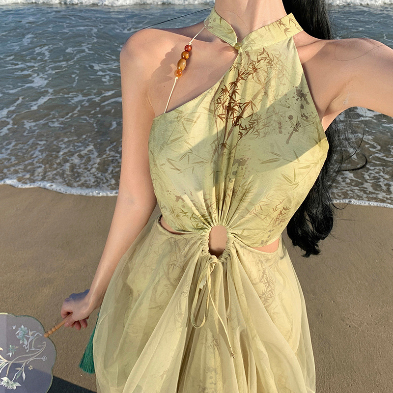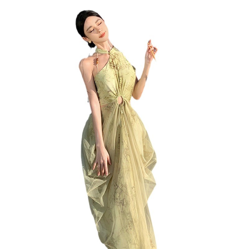竹叶青·清冷新中式网纱竹子晕染镂空挂脖连衣裙夏女