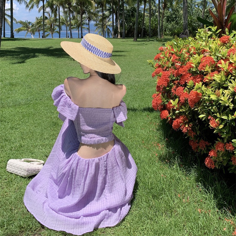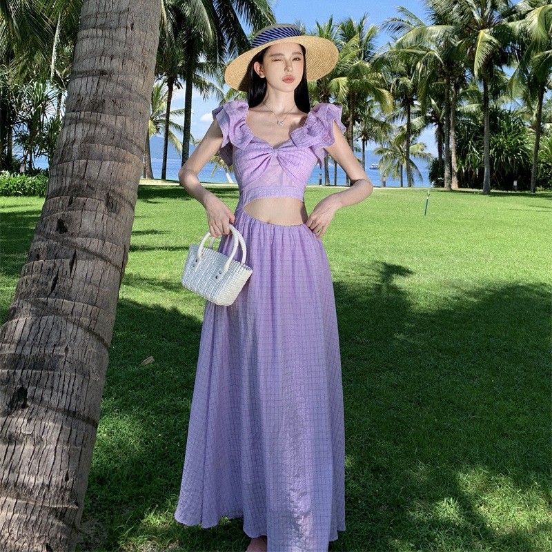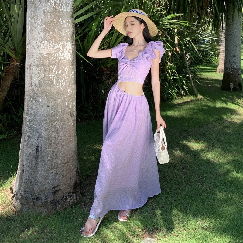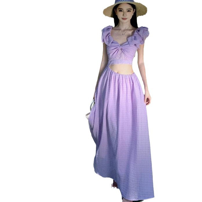 法式度假风小飞袖连衣裙女夏季新款设计感小众露腰茶歇裙子潮