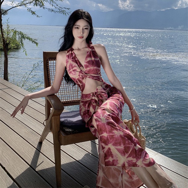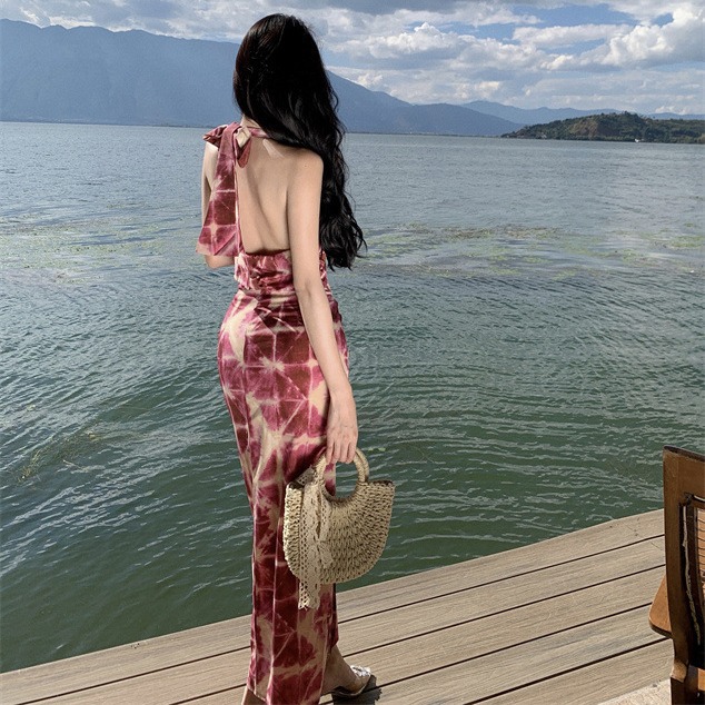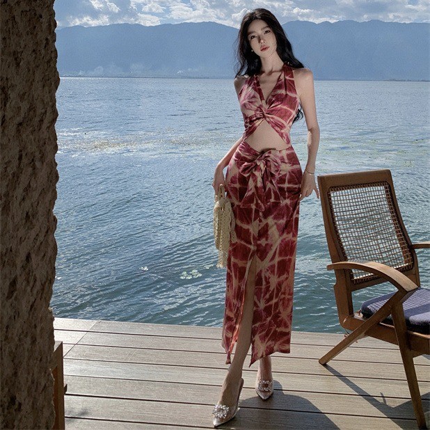 设计感镂空印花露腰蝴蝶结饰开叉拼接连衣裙夏季新款露背性感气质