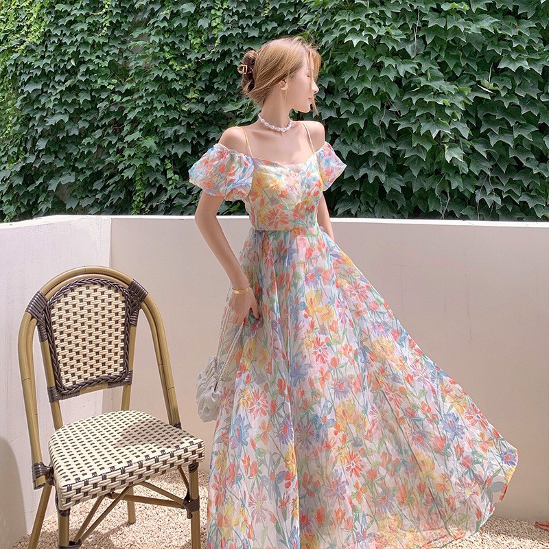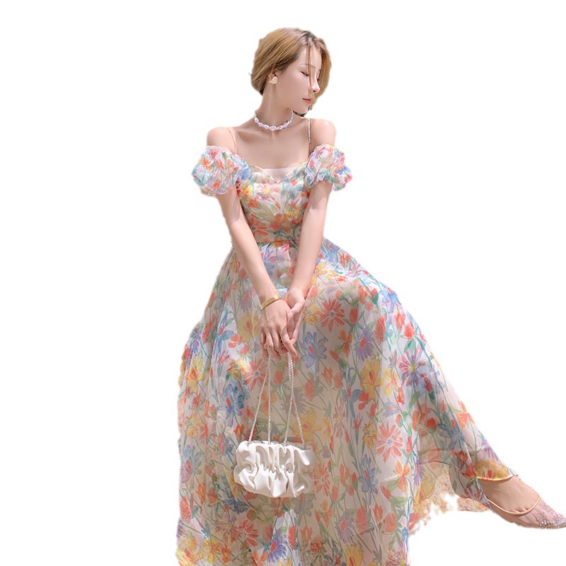 蝶翼柯根纱一字肩泡泡袖碎花吊带连衣裙春夏新款长裙子