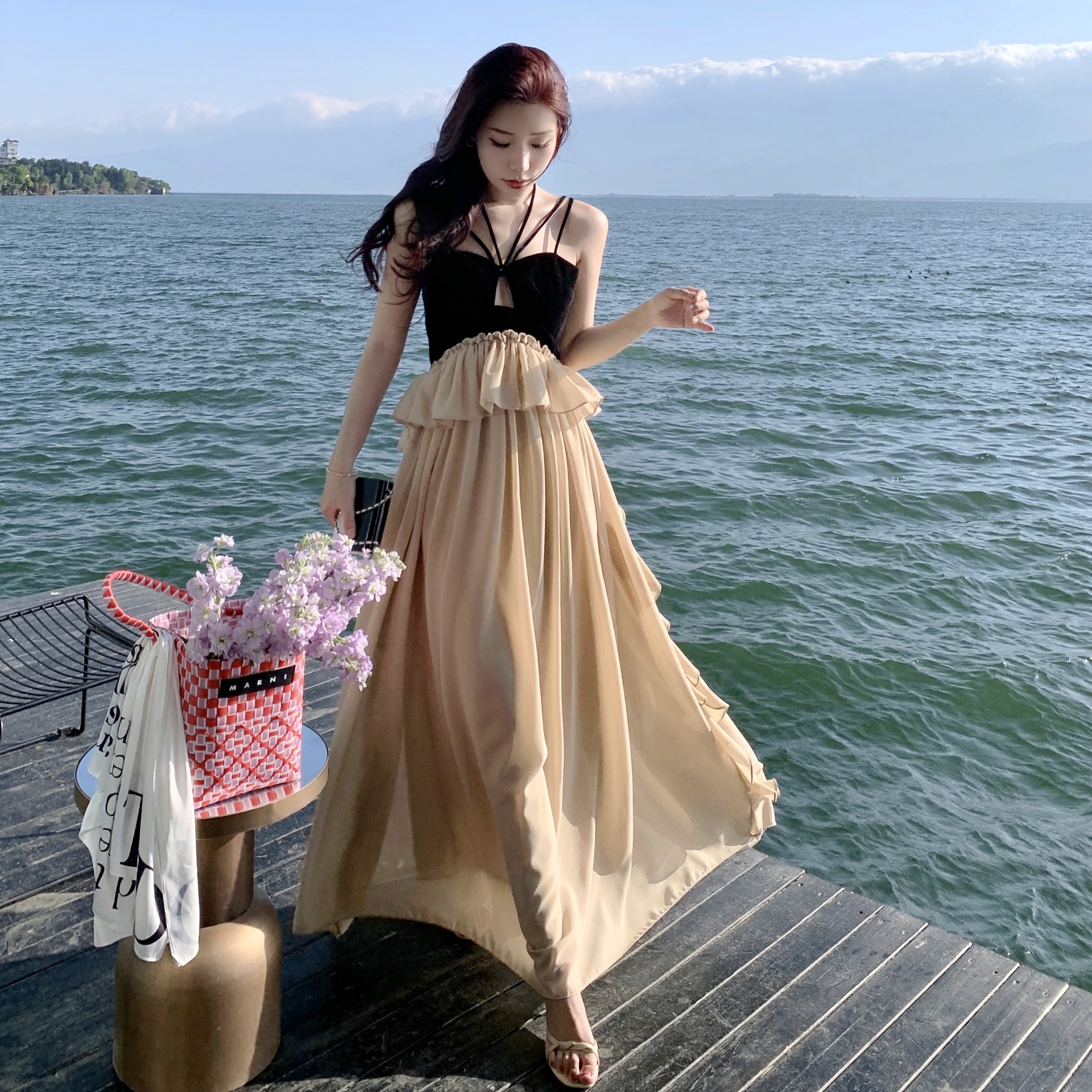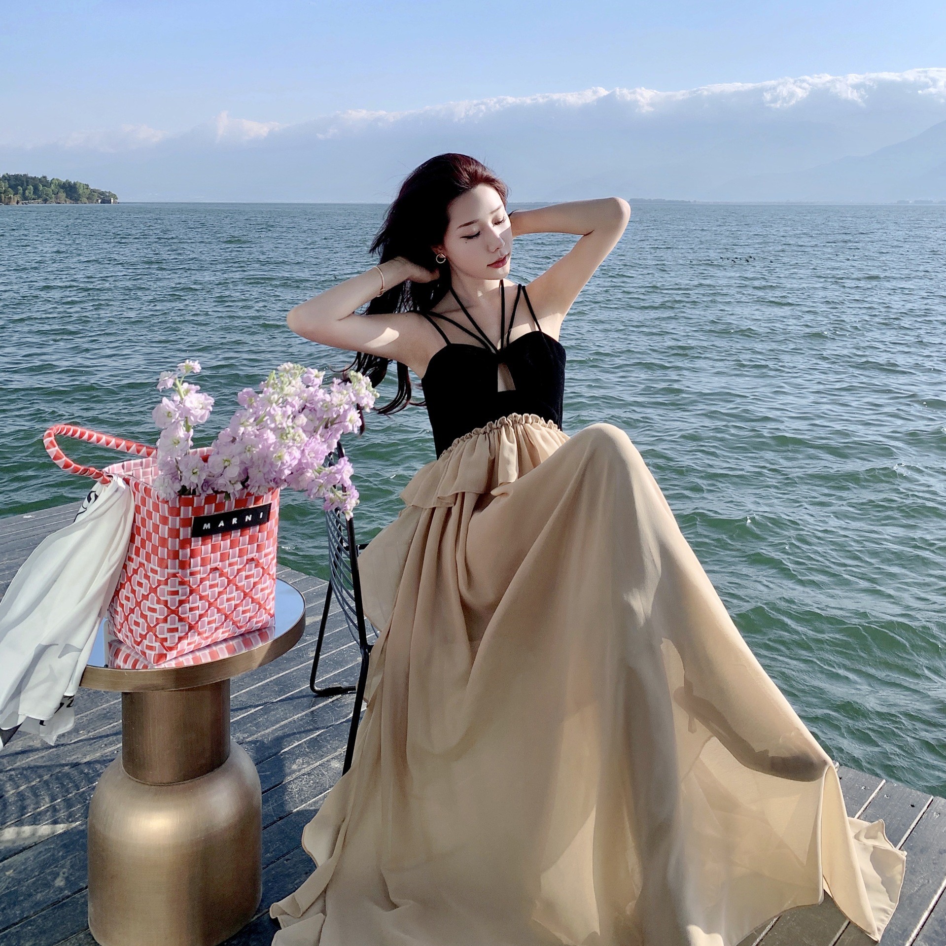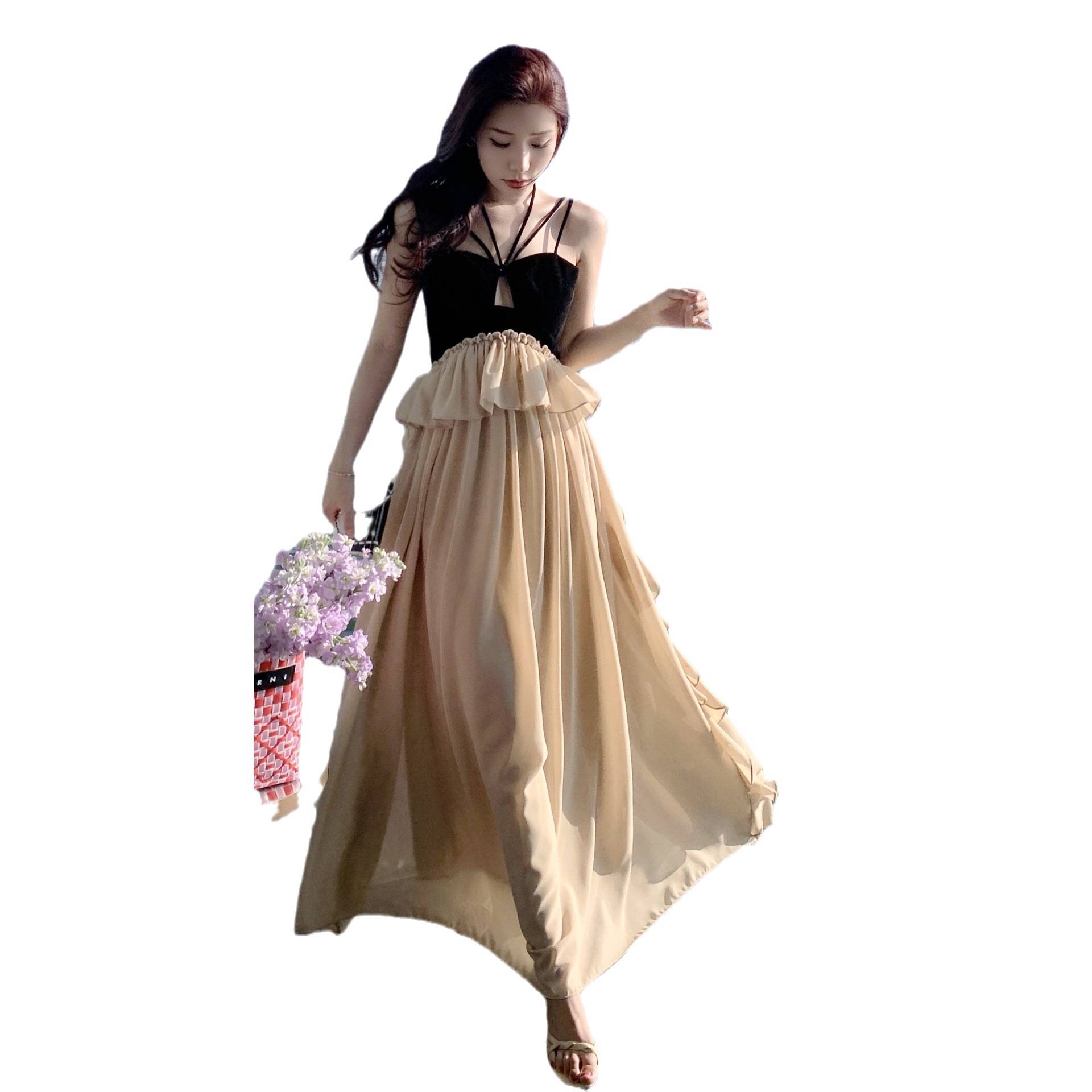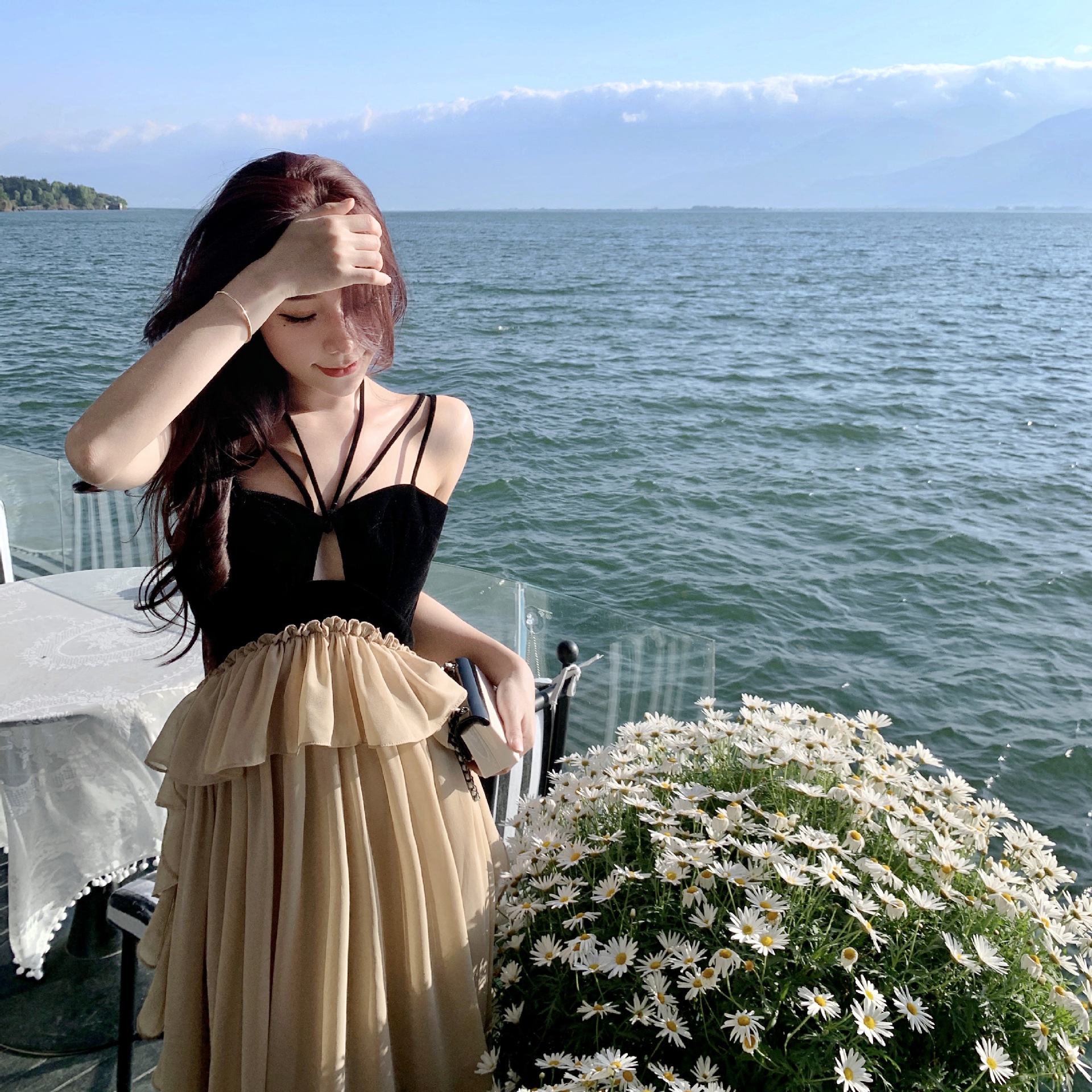 法式复古设计感纯欲风挂脖丝绒拼接吊带连衣裙高级感气质礼服长裙