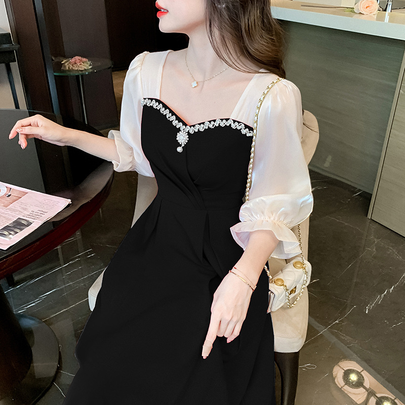 复古休闲风拼色圆领字母印花假两件T恤开叉夏季新款连衣裙女