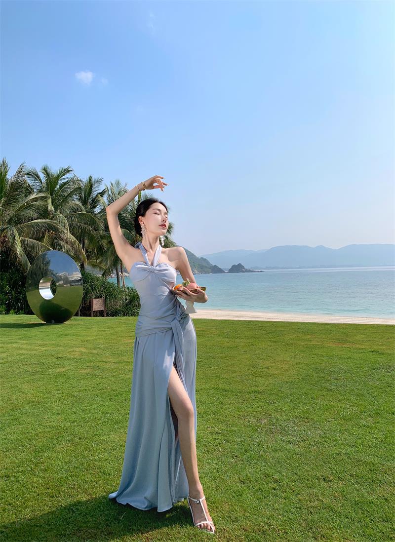 梦幻冰心蓝浪漫飘逸仙女长裙挂脖飘带侧开叉拖地度假连衣裙