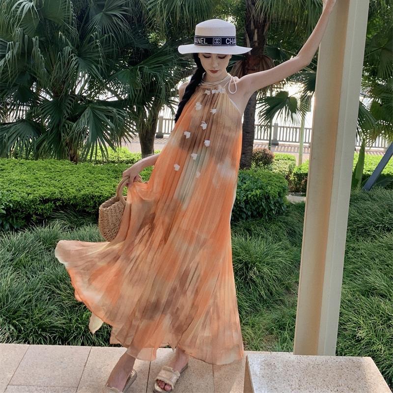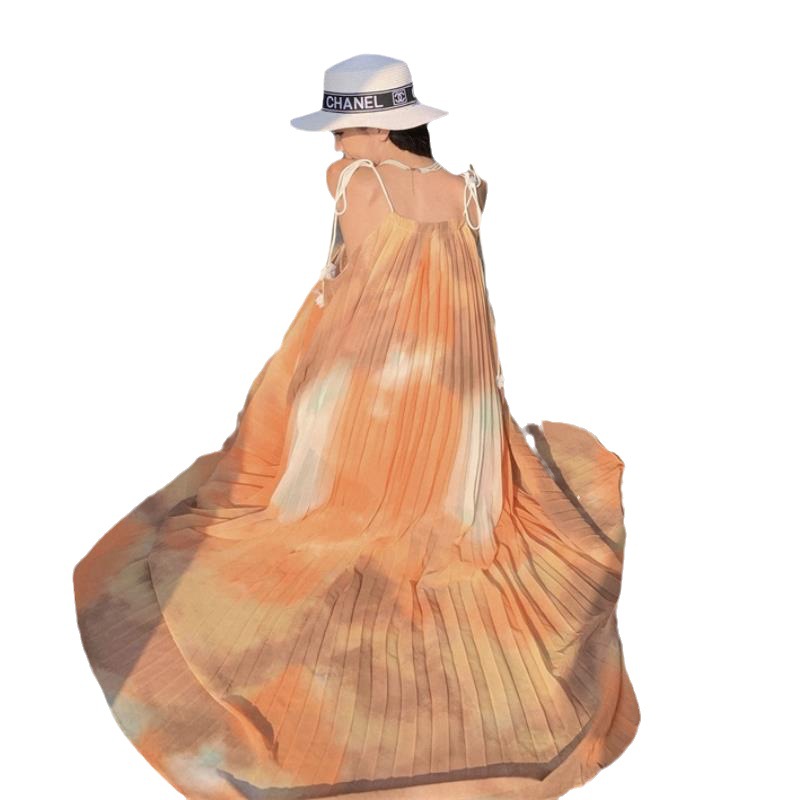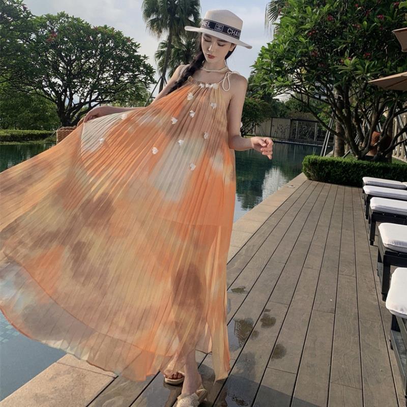 晕染落日斑驳吊带裙女装夏季新款花朵风琴褶气质慵懒连衣裙