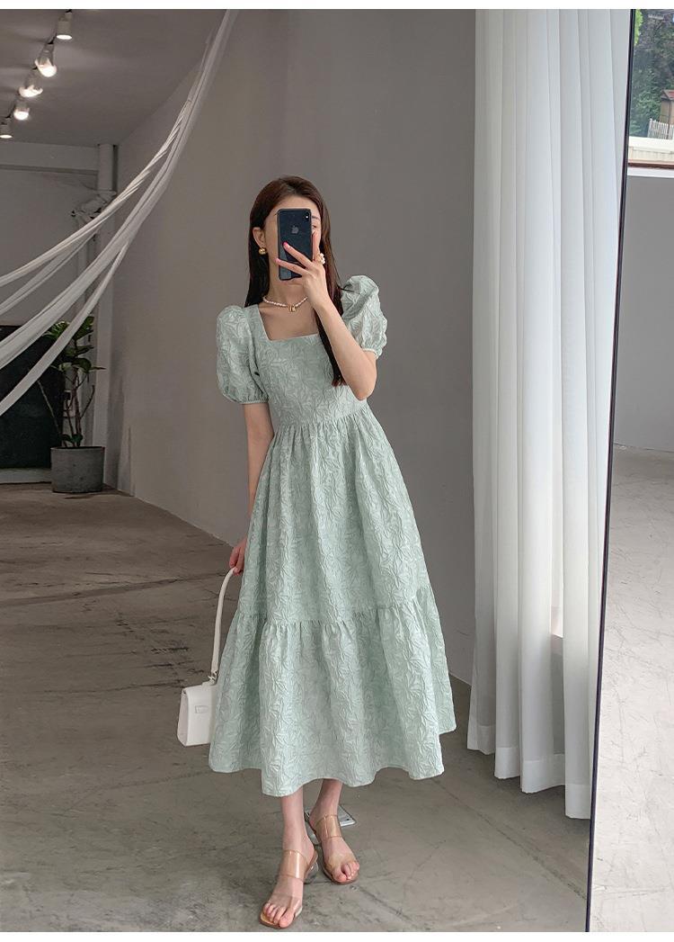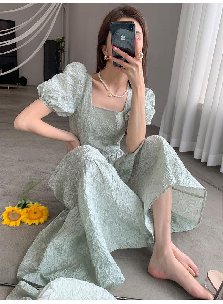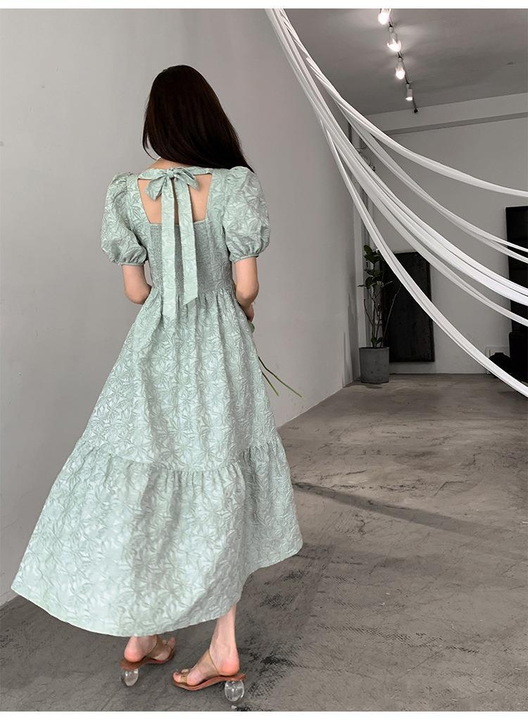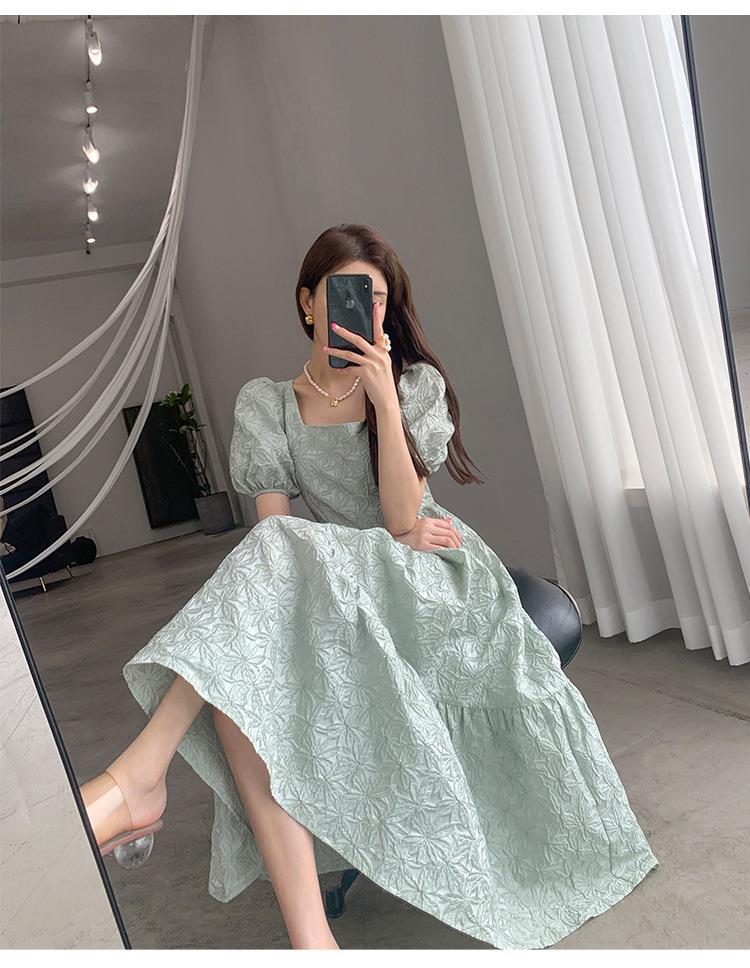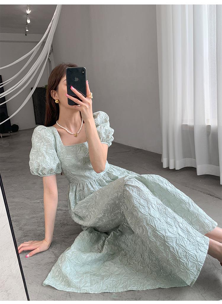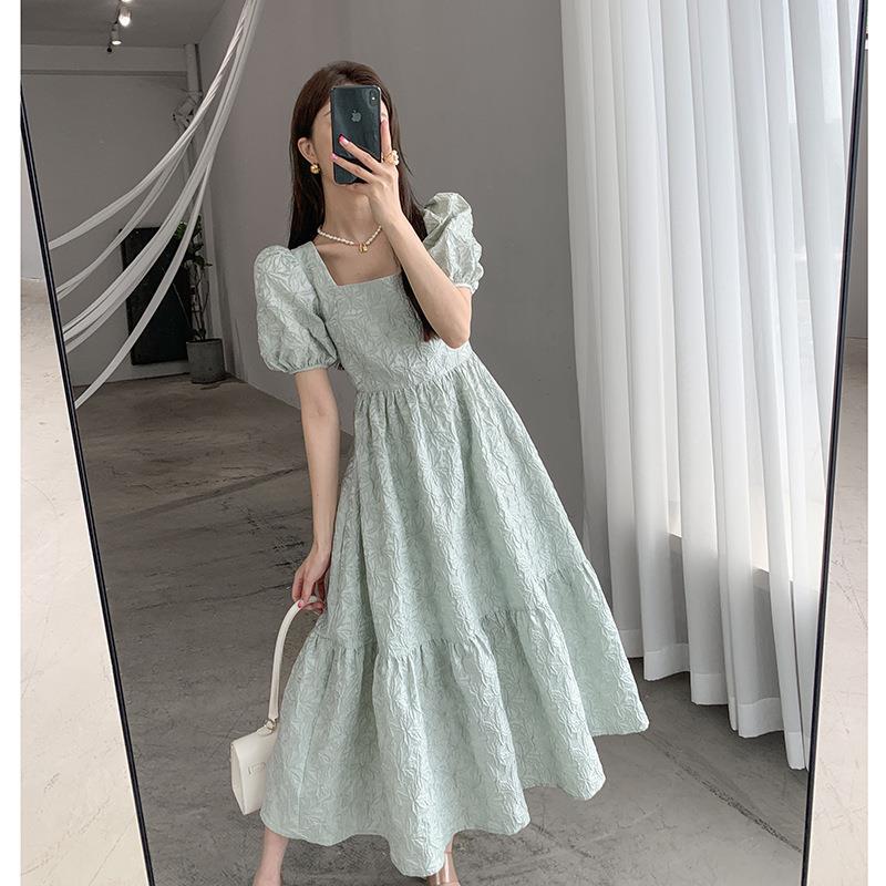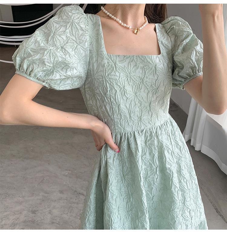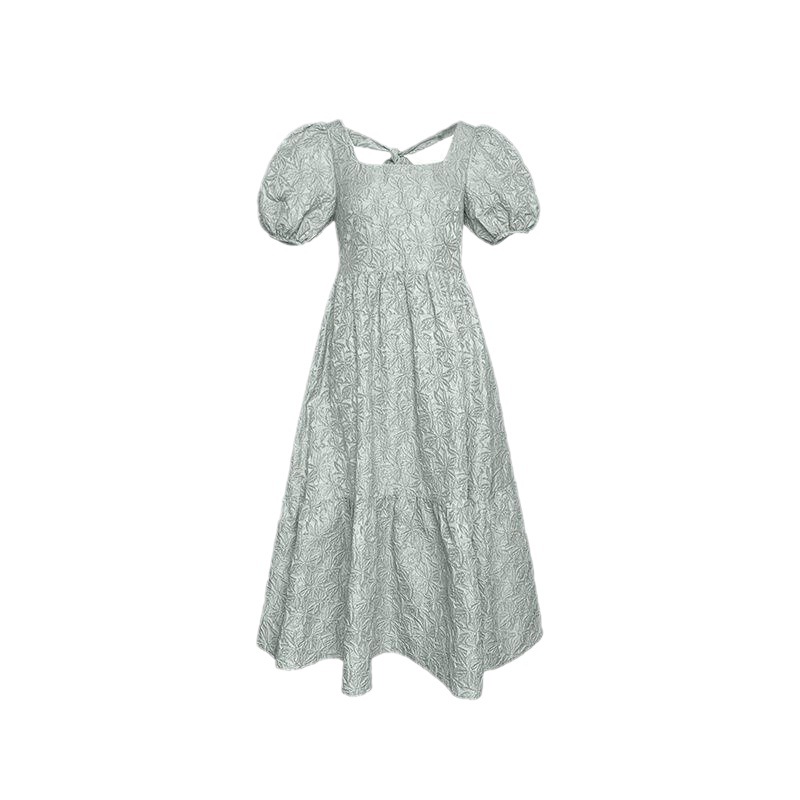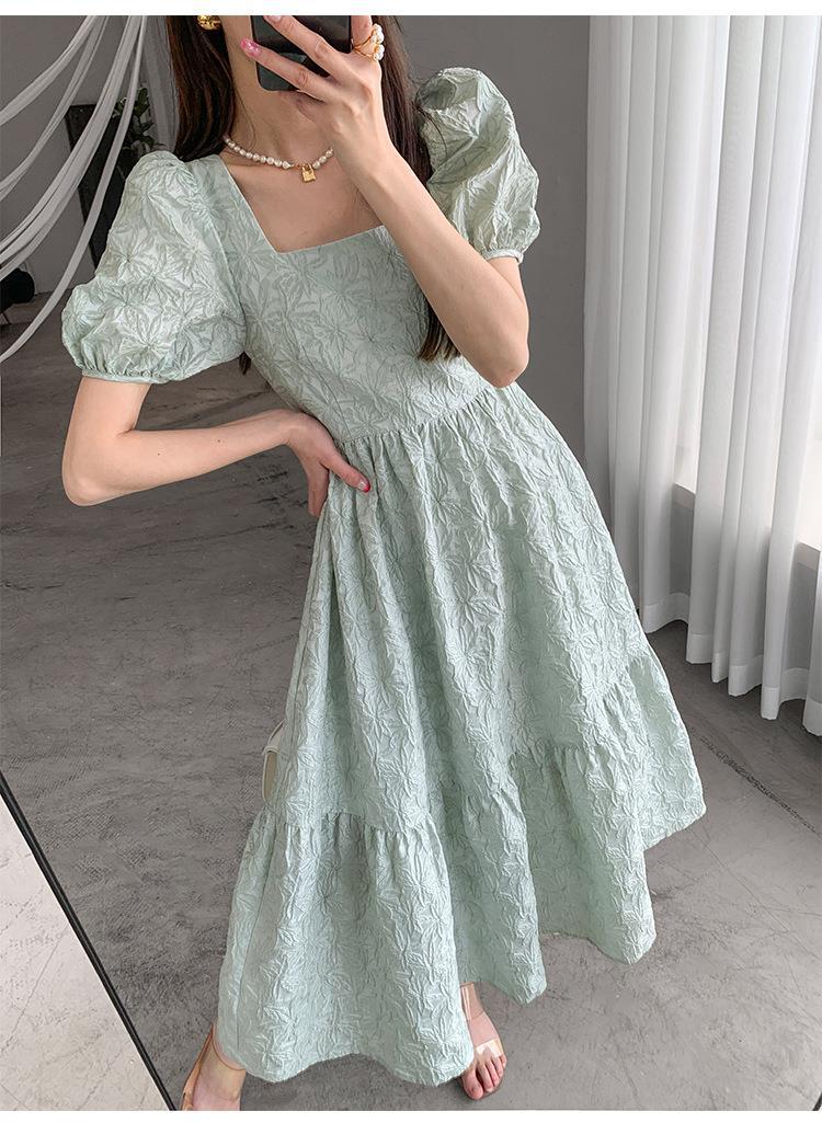 浅绿色泡泡袖连衣裙女夏季新款方领法式高级感提花长裙