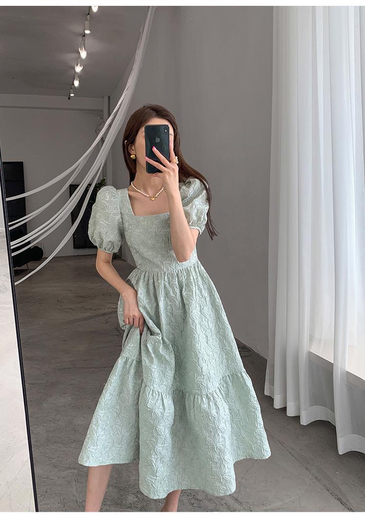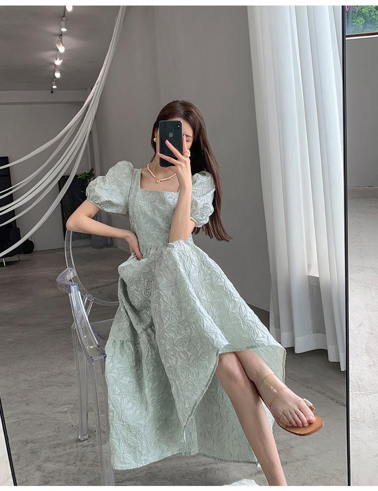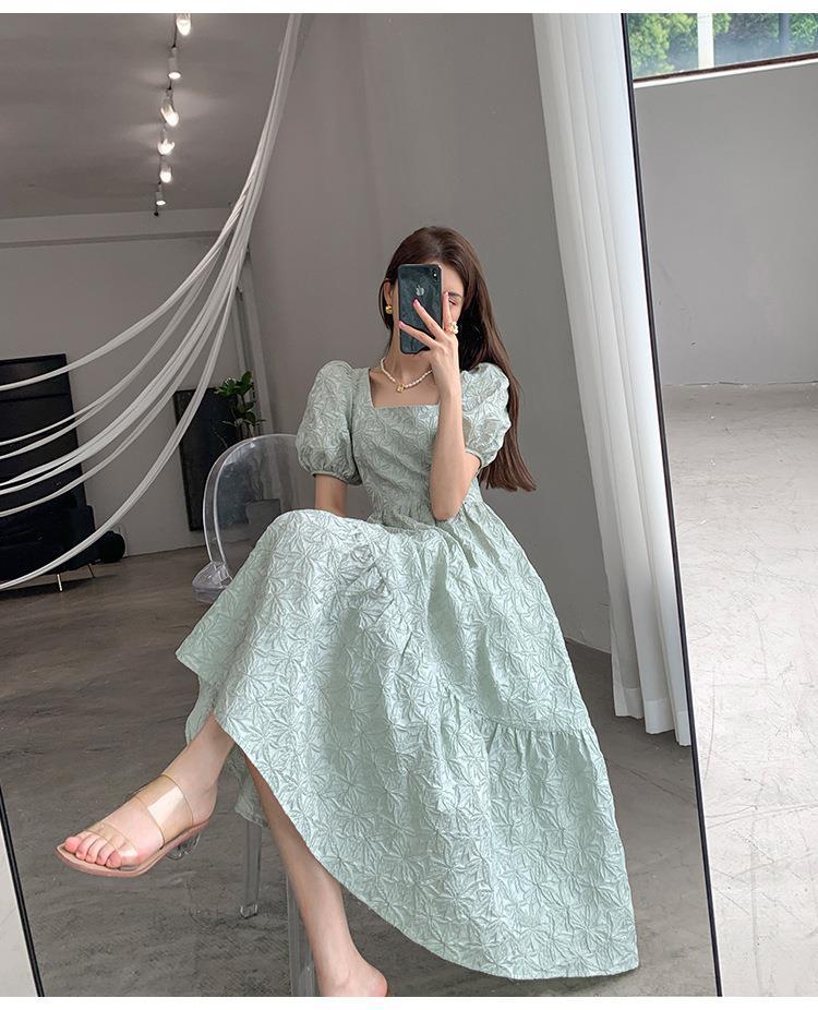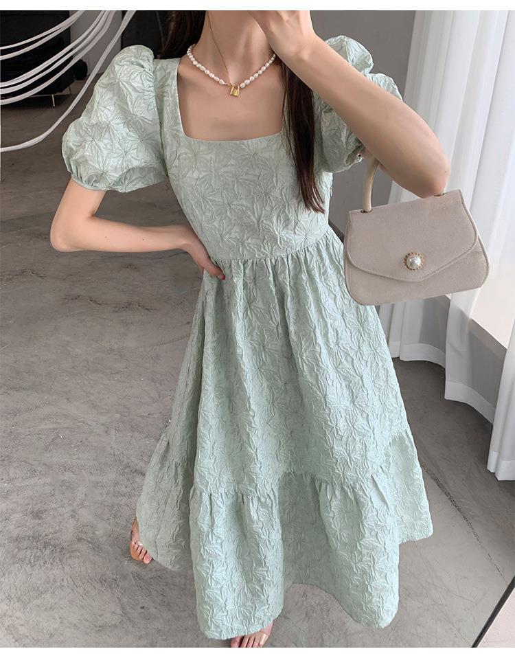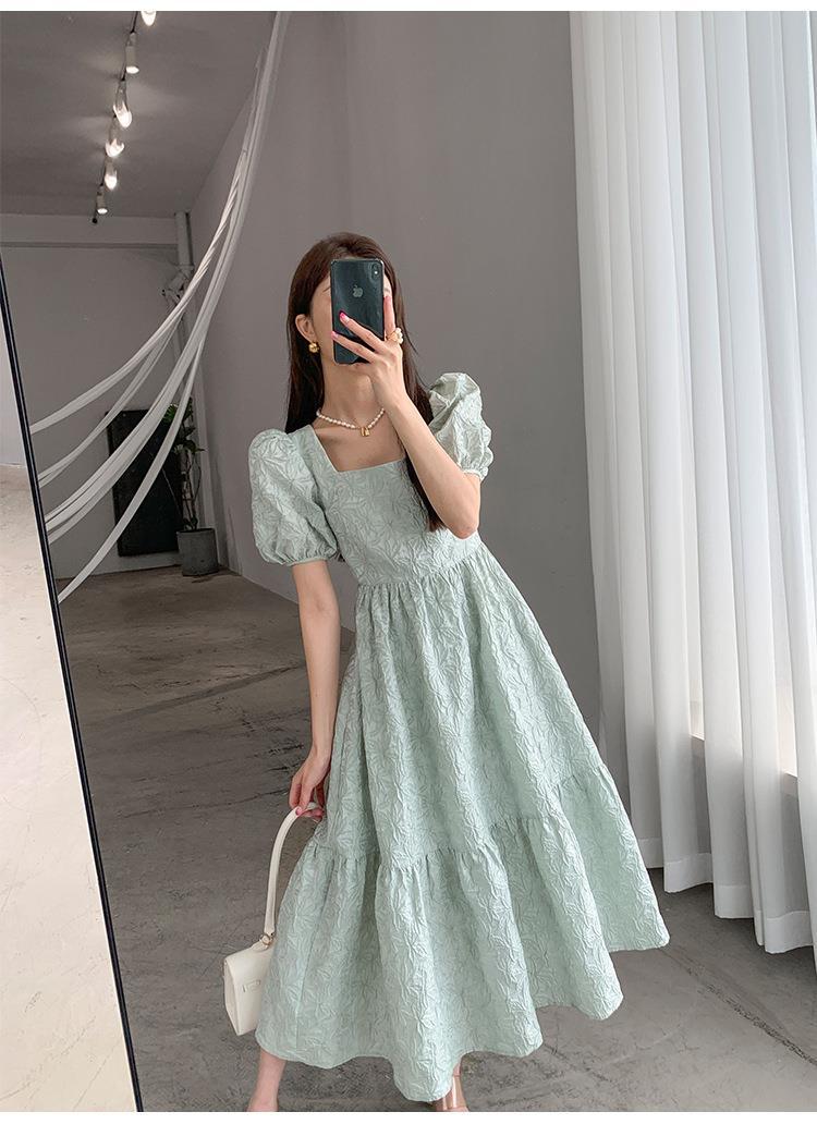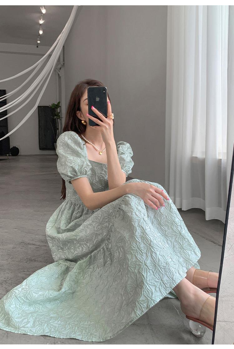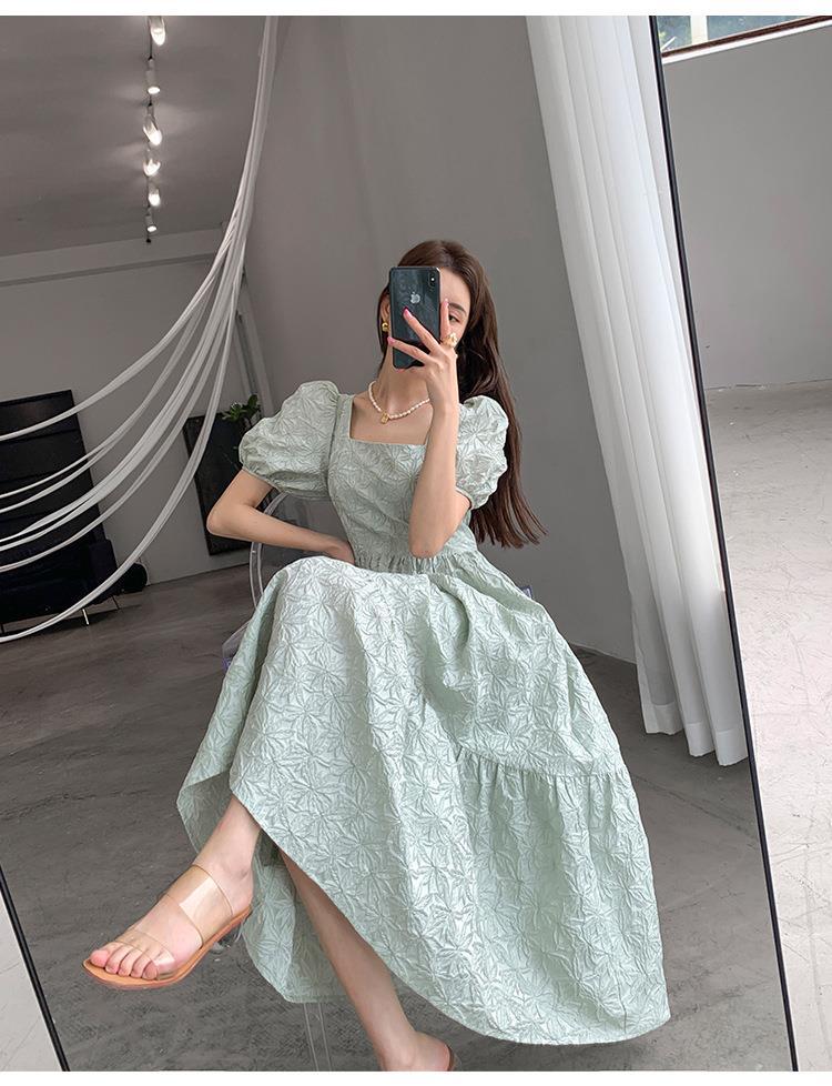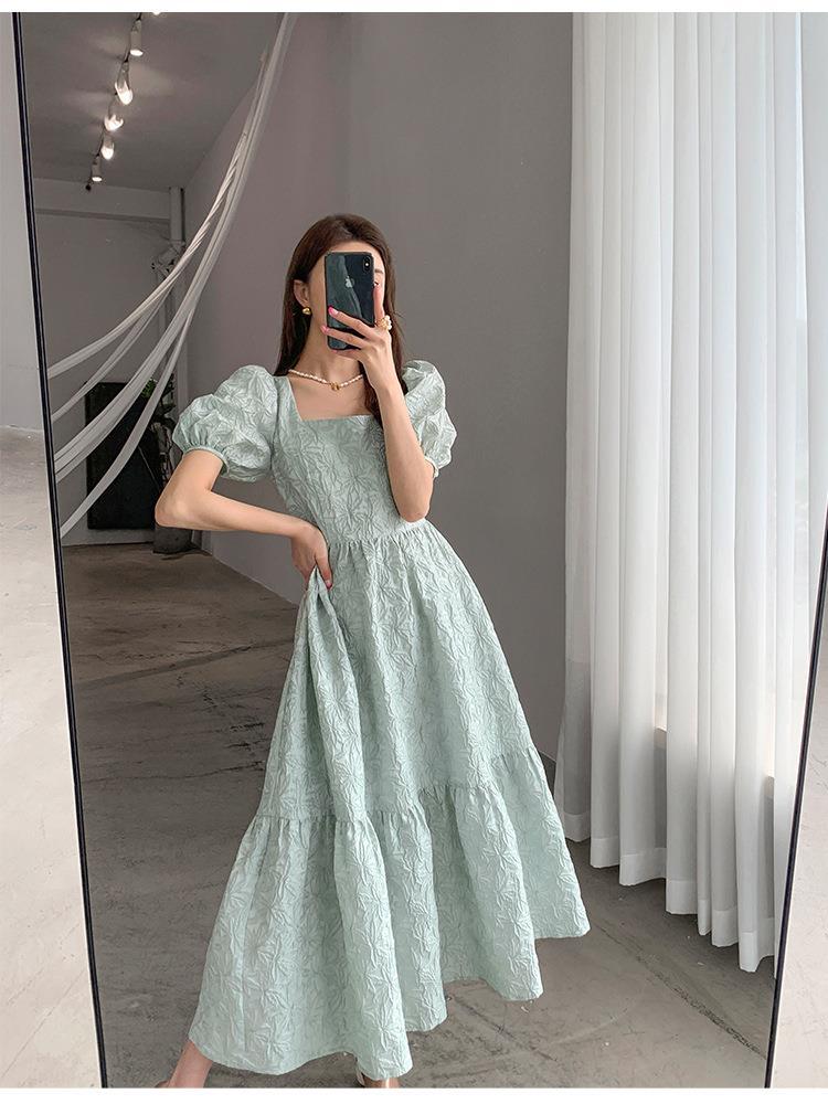 浅绿色泡泡袖连衣裙女夏季新款方领法式高级感提花长裙