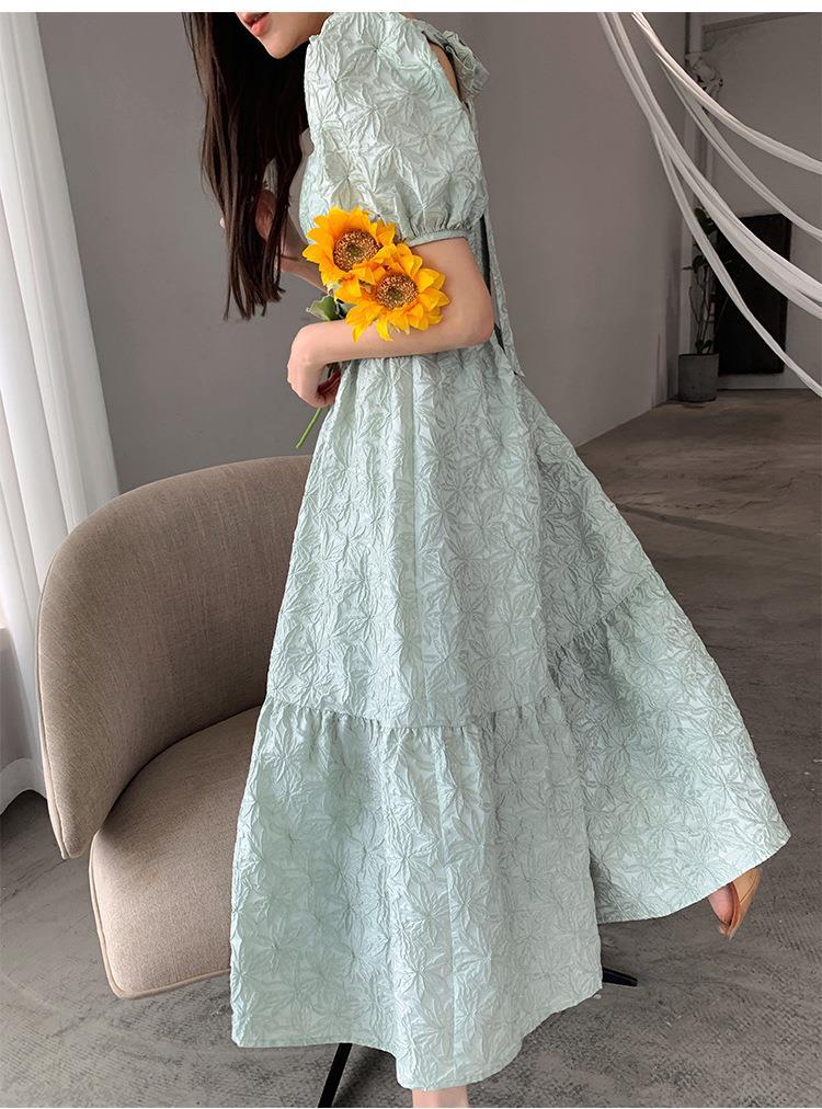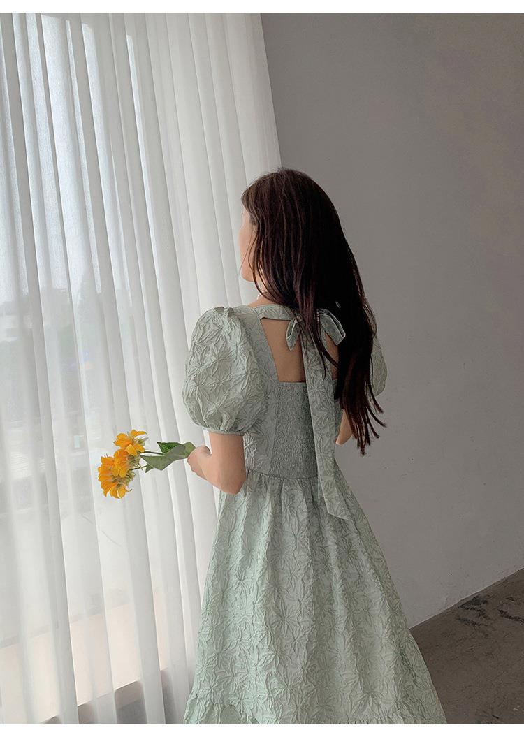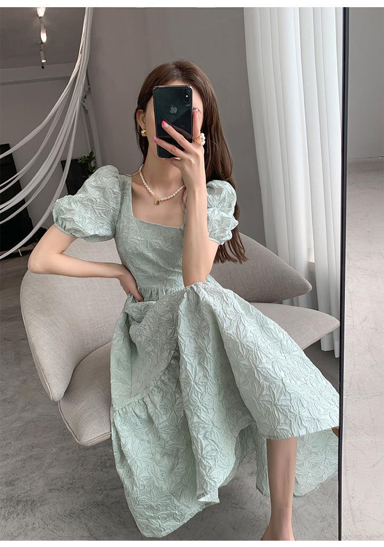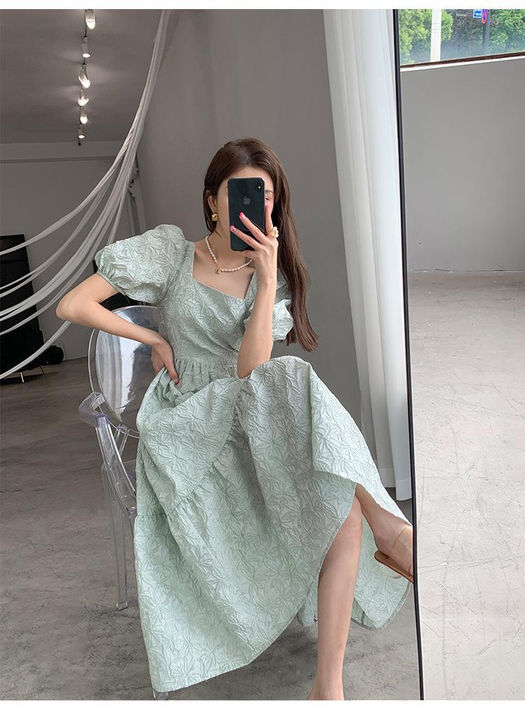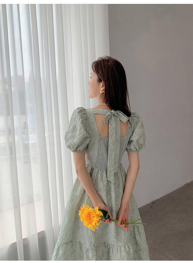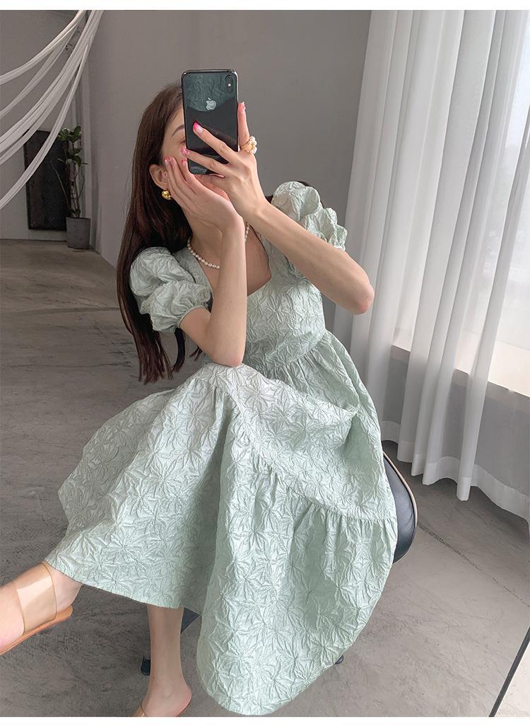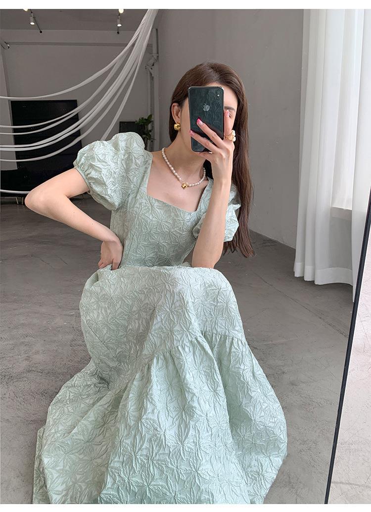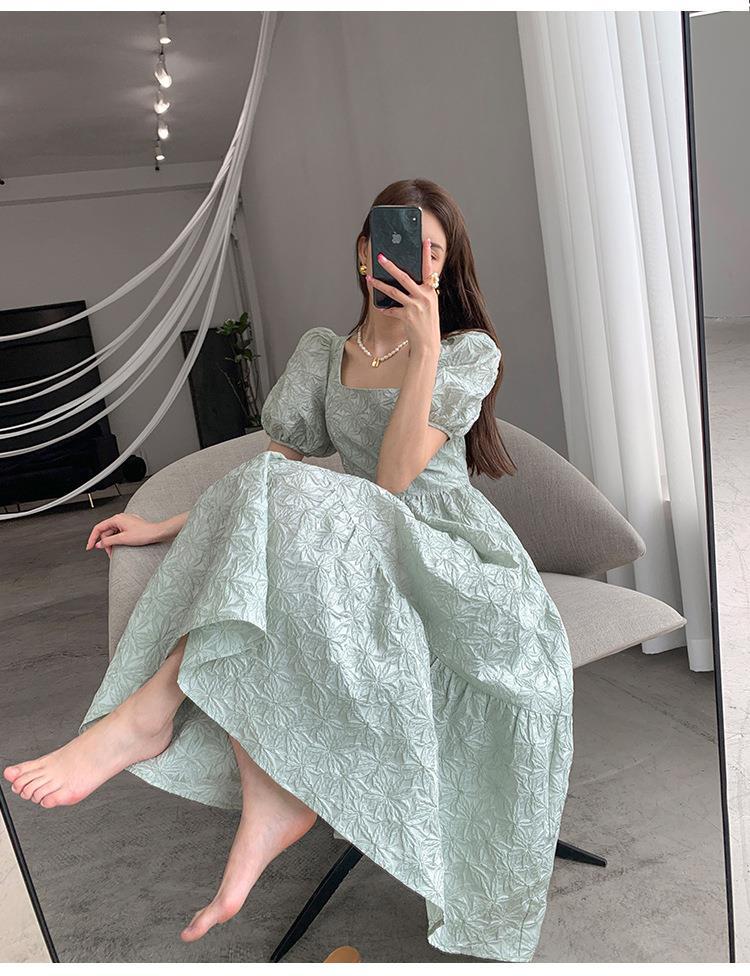 浅绿色泡泡袖连衣裙女夏季新款方领法式高级感提花长裙