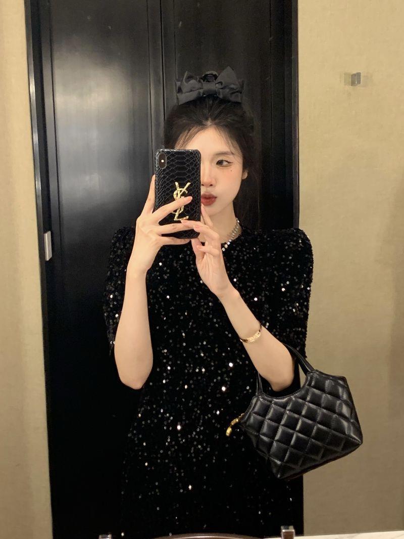新款法式高级感收腰显瘦气质小黑裙闪闪亮片短袖连衣裙女夏季