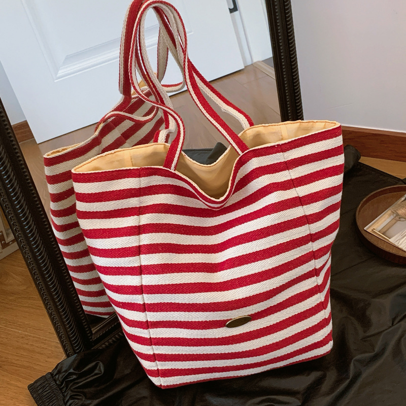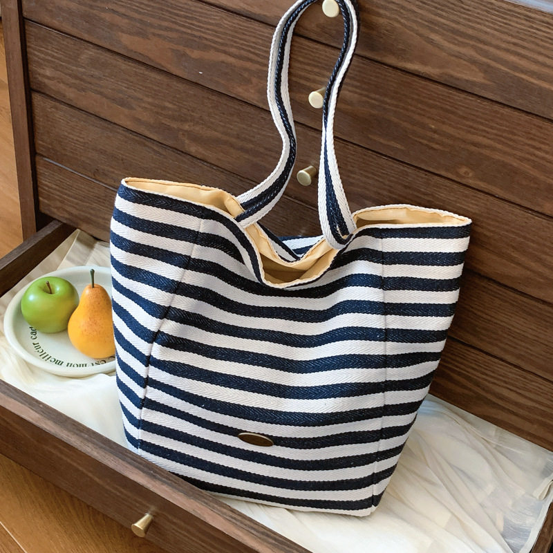 帆布包包女大容量新款秋季休闲单肩购物袋条纹上课通勤托特包