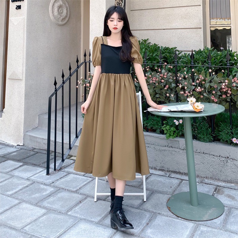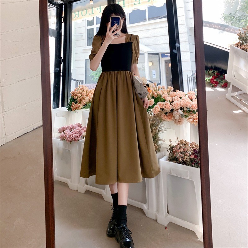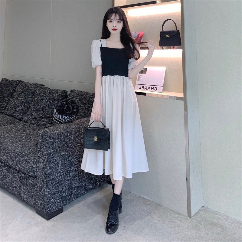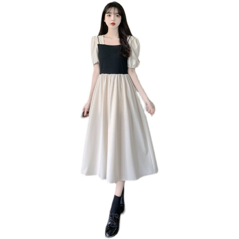 法式方领假两件短袖连衣裙女夏季新大码胖mm收腰显瘦裙子女