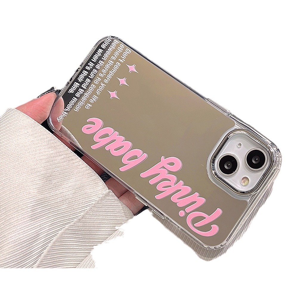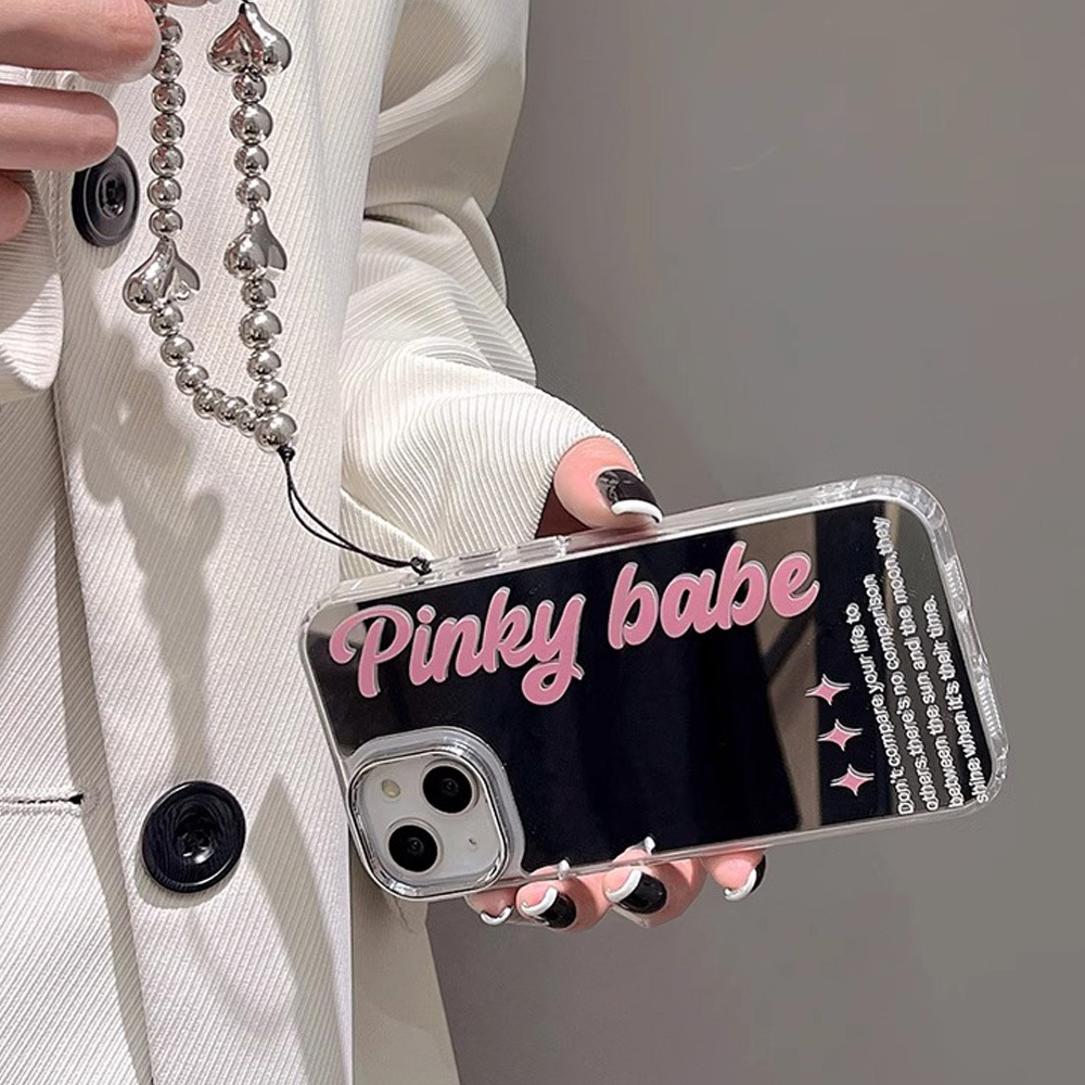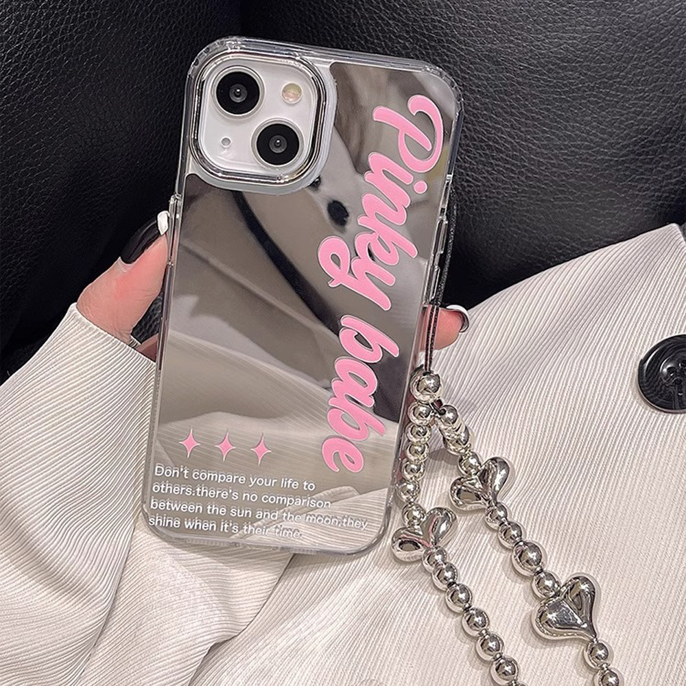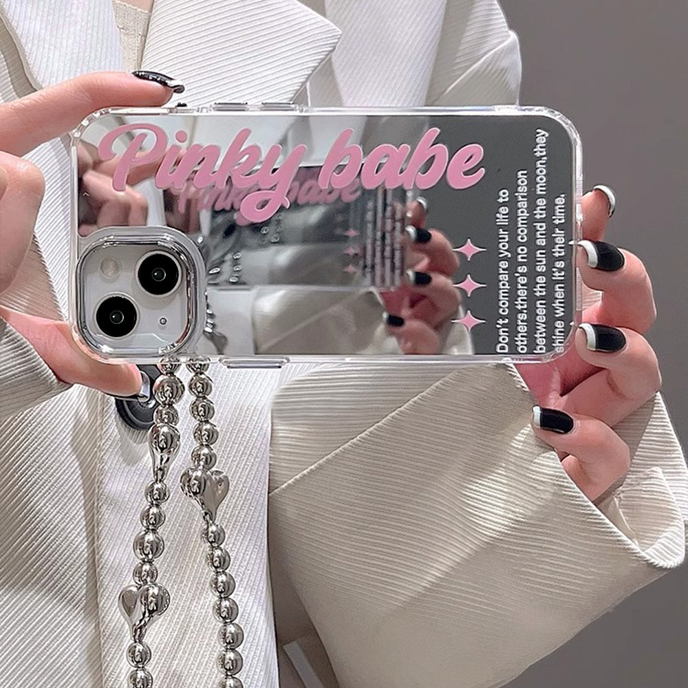 梦幻粉色镜面英文带爱心链条苹果15ProMax手机壳新款iPhone14全包