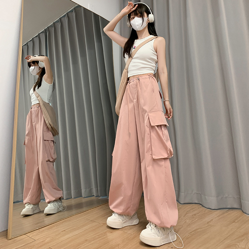 锦纶工装裤女装夏季女设计感直筒阔腿裤休闲大口袋美式运动裤
