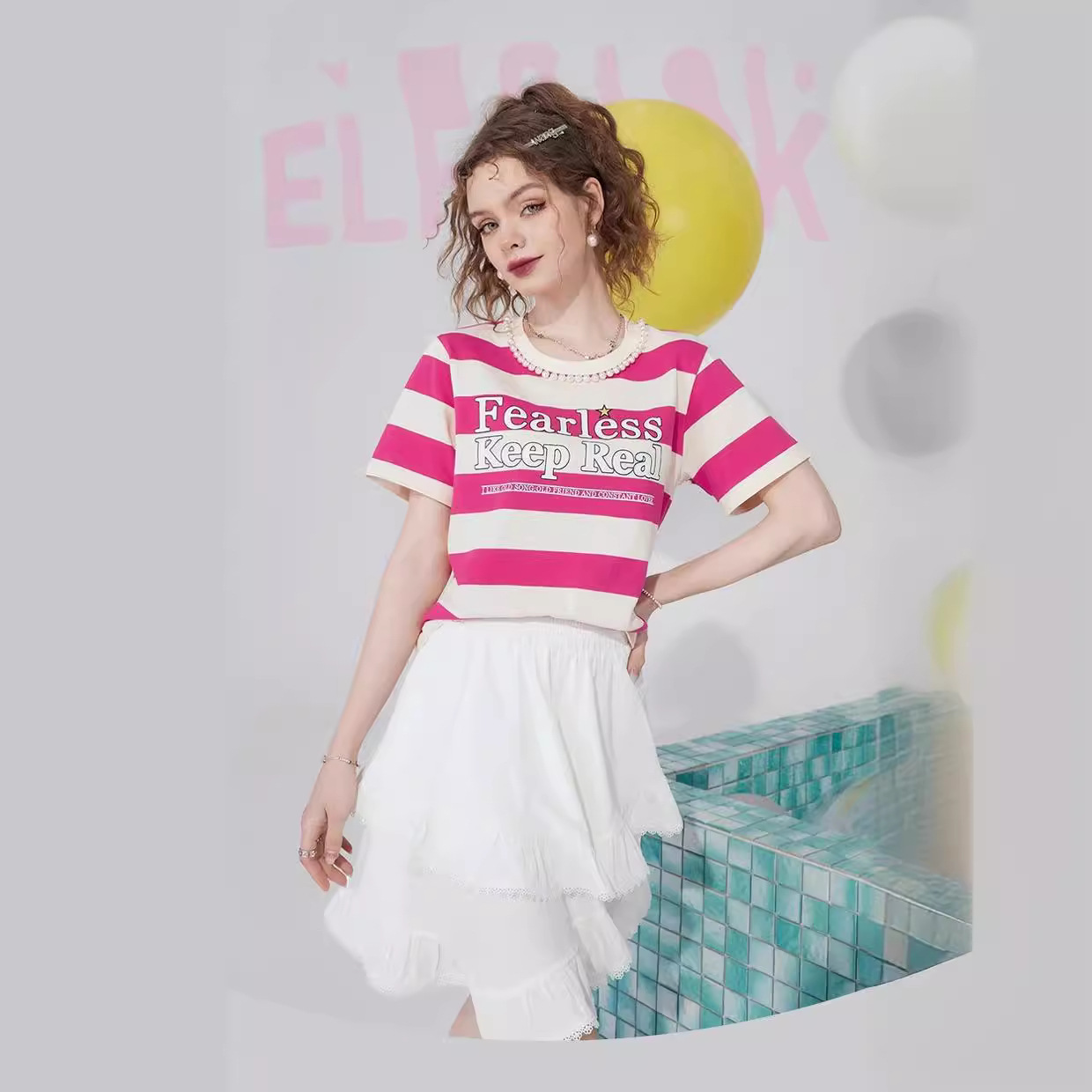 短袖正肩条纹t恤女夏季新款宽松显瘦设计感上衣潮