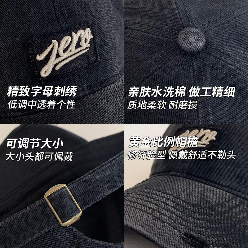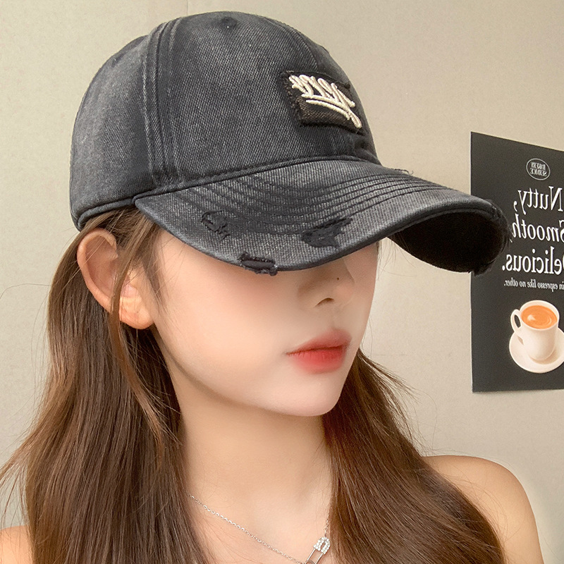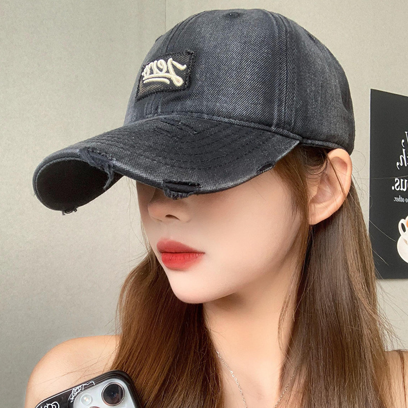 美式水洗牛仔刺绣棒球帽女夏季遮阳大头围显脸小破洞弯檐鸭舌帽子