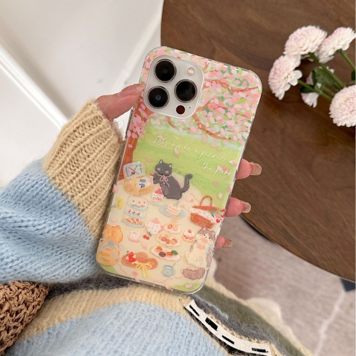 野餐猫咪卡通可爱双层适用苹果15ProMax手机壳iPhone14防摔13全部