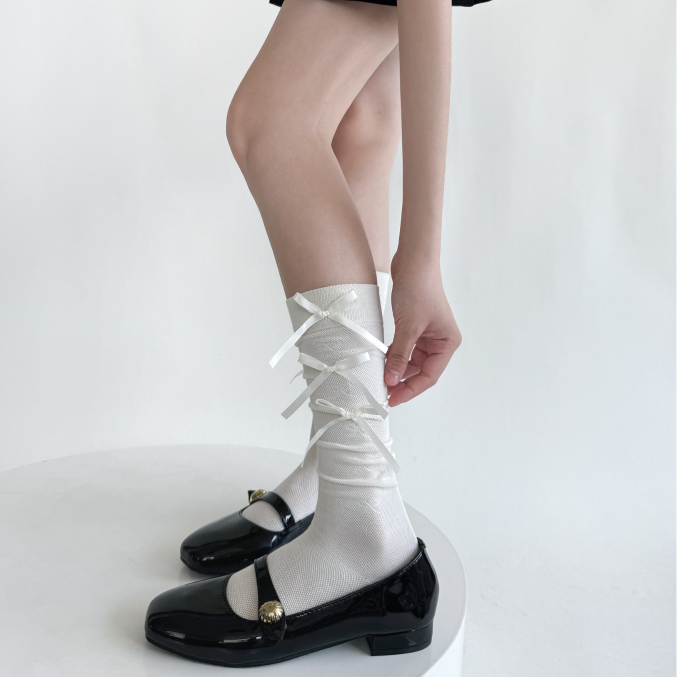 春夏甜美蝴蝶结堆堆小腿袜女蝴蝶提花薄款后跟飘带奶白爱心中筒袜