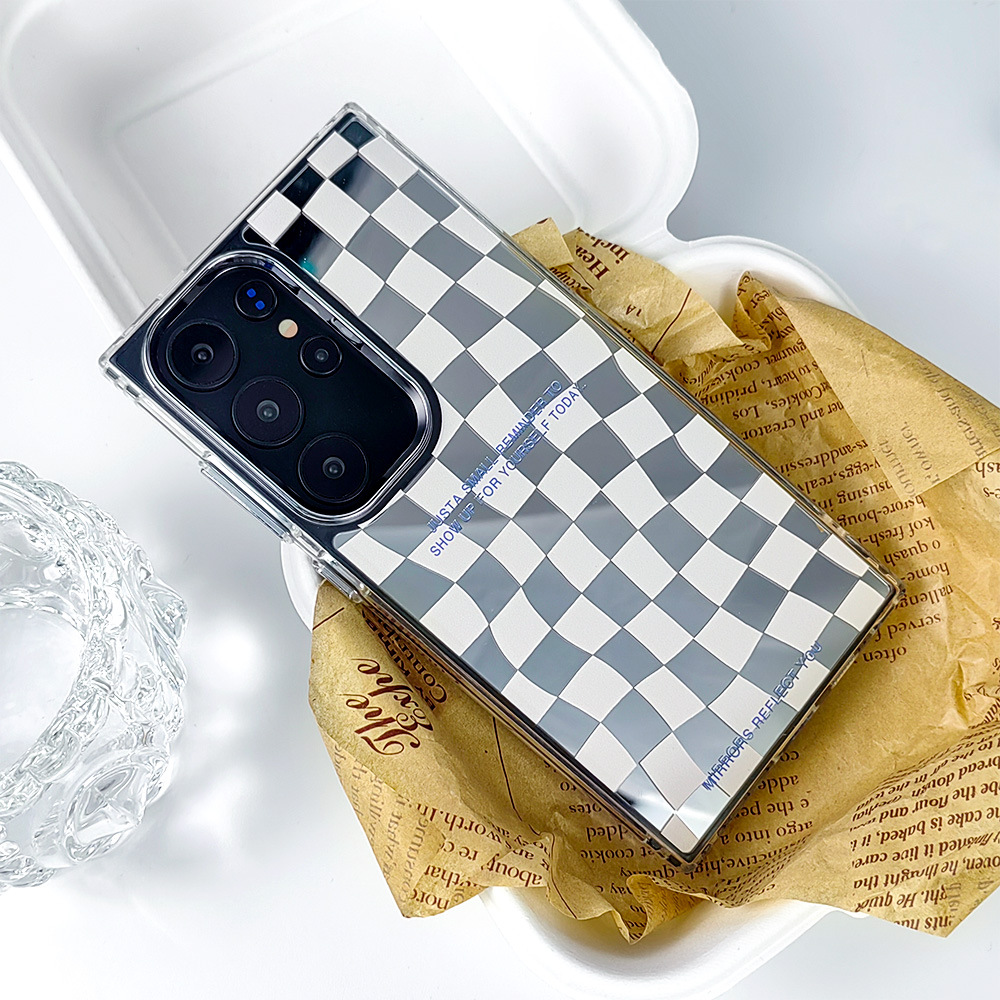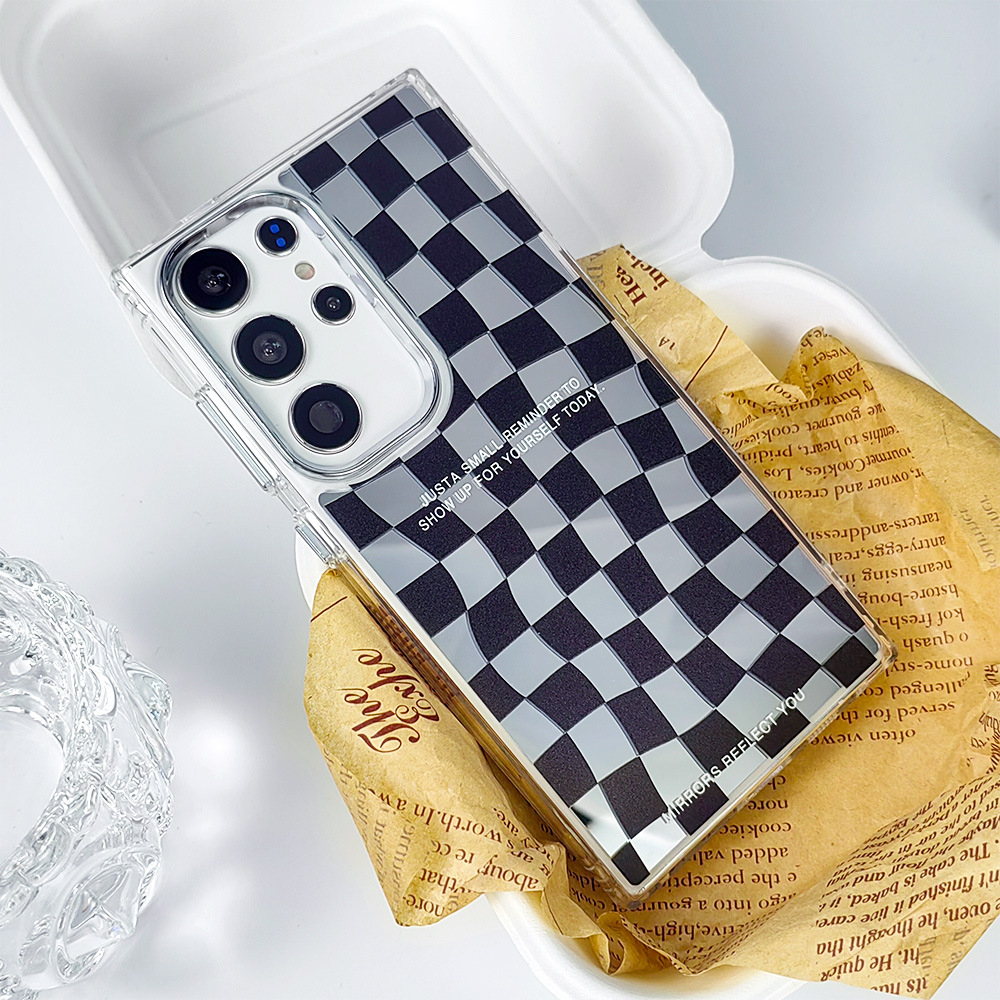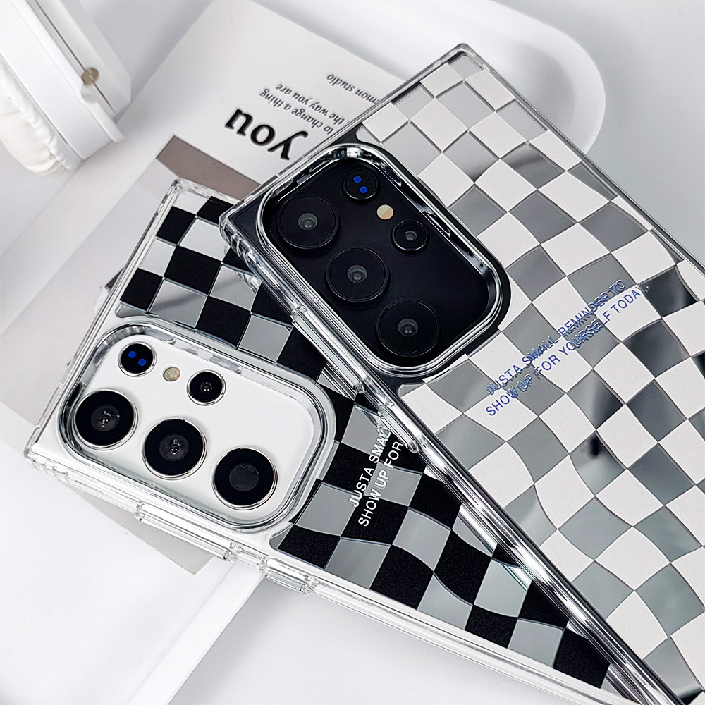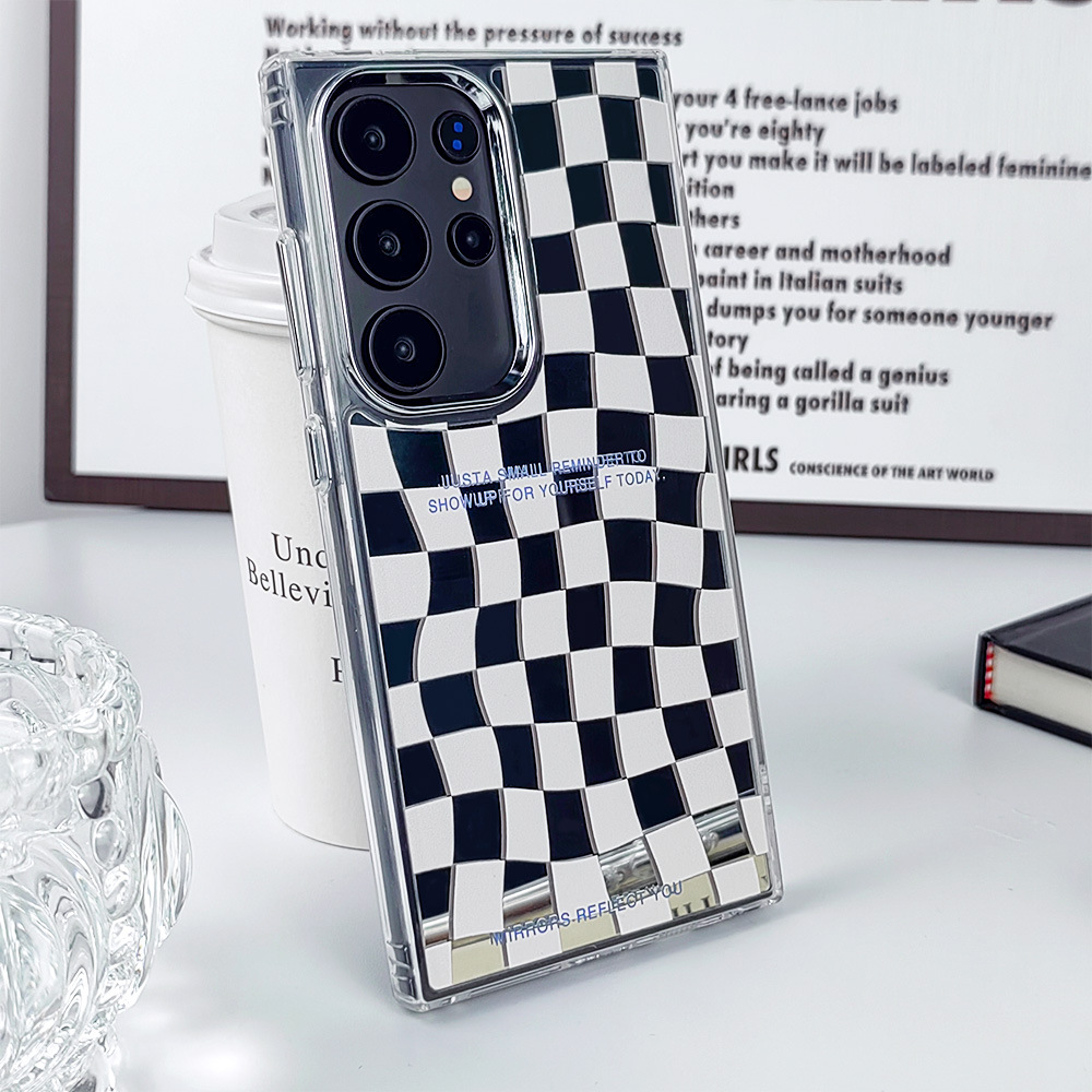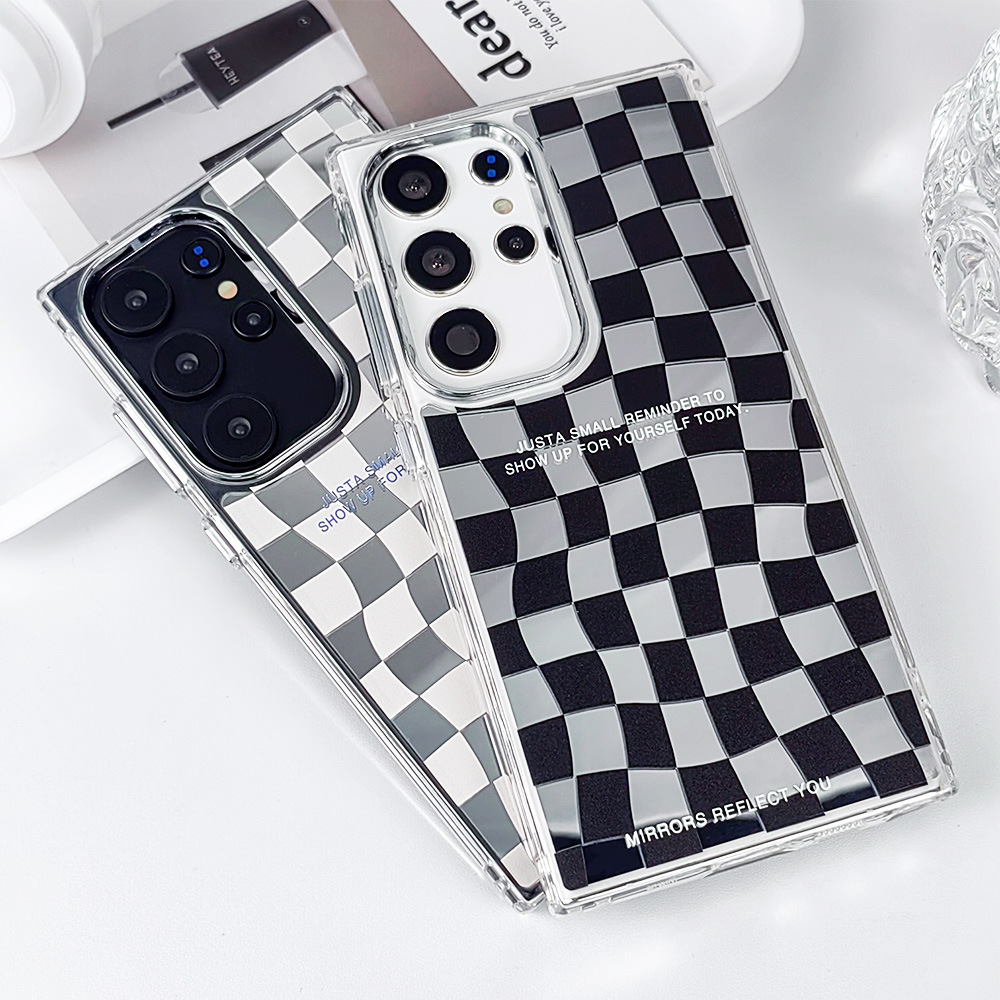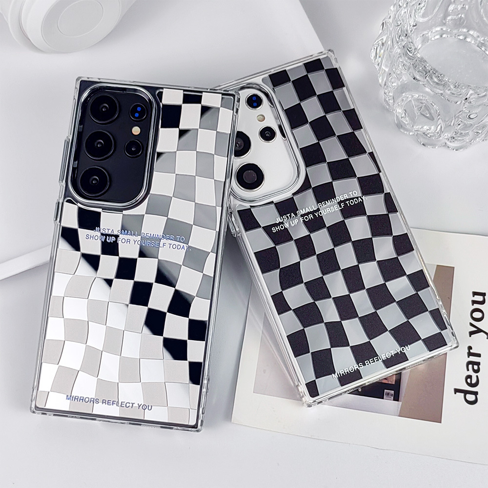 复古黑白镜面棋盘格子S23Ultra手机壳S21FE防震A32简约S24情侣A13