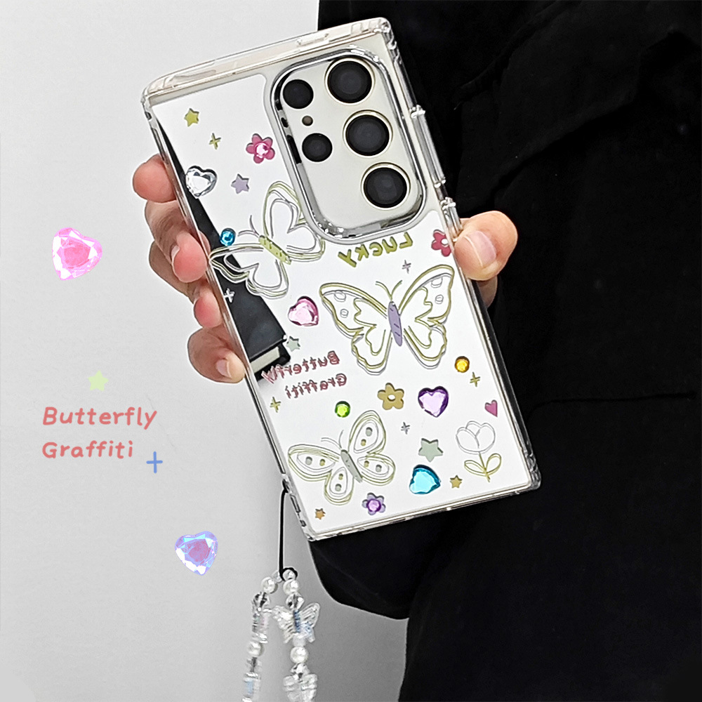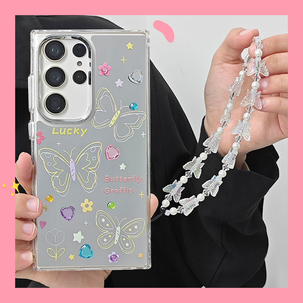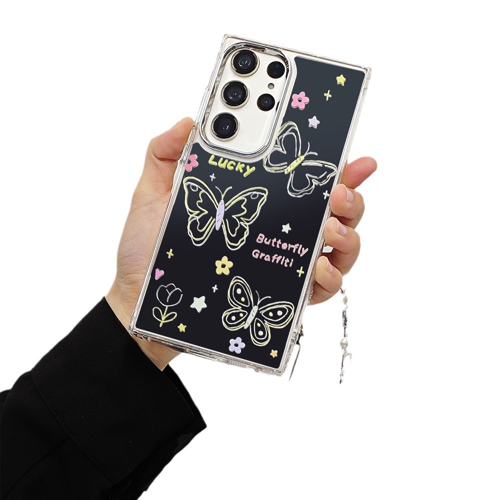 梦幻涂鸦线条蝴蝶带链条S24Ultra手机壳防震S24Plus镜面S21FE可爱