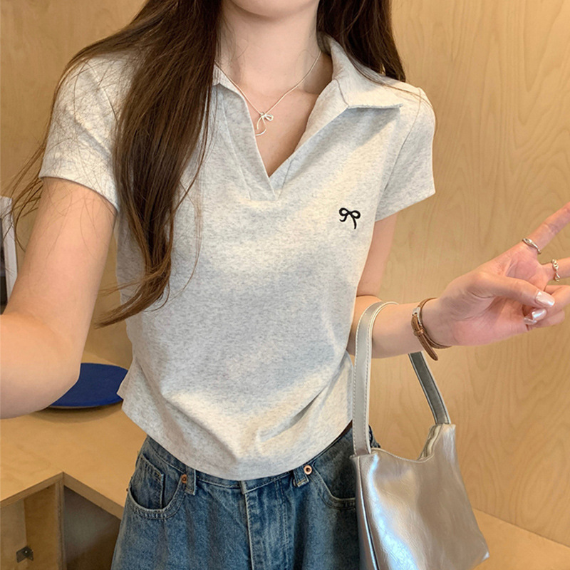 纯棉辣妹别致Polo领蝴蝶结刺绣短袖T恤女夏设计感褶皱不规则上衣
