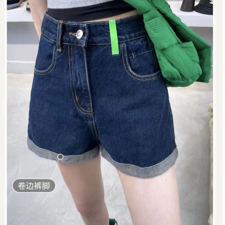 夏季新款韩版时尚深蓝色弹力高腰显瘦卷边阔腿a字牛仔短裤女