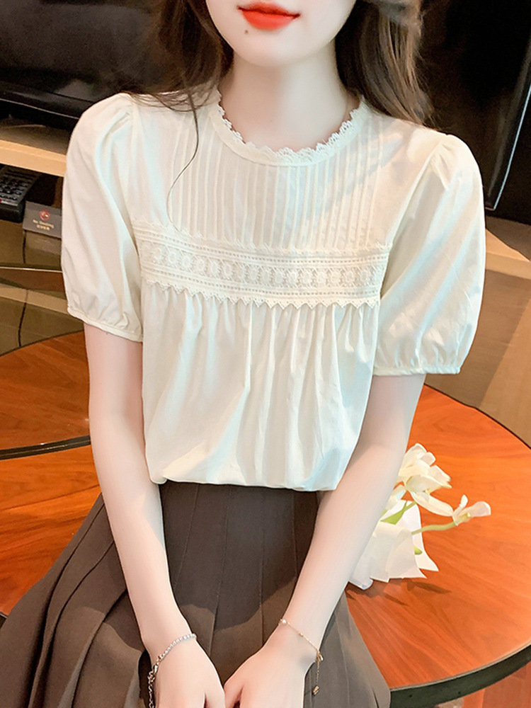 法式时尚圆领短袖衬衫女装夏季宽松显瘦时尚感设计套头上衣夏