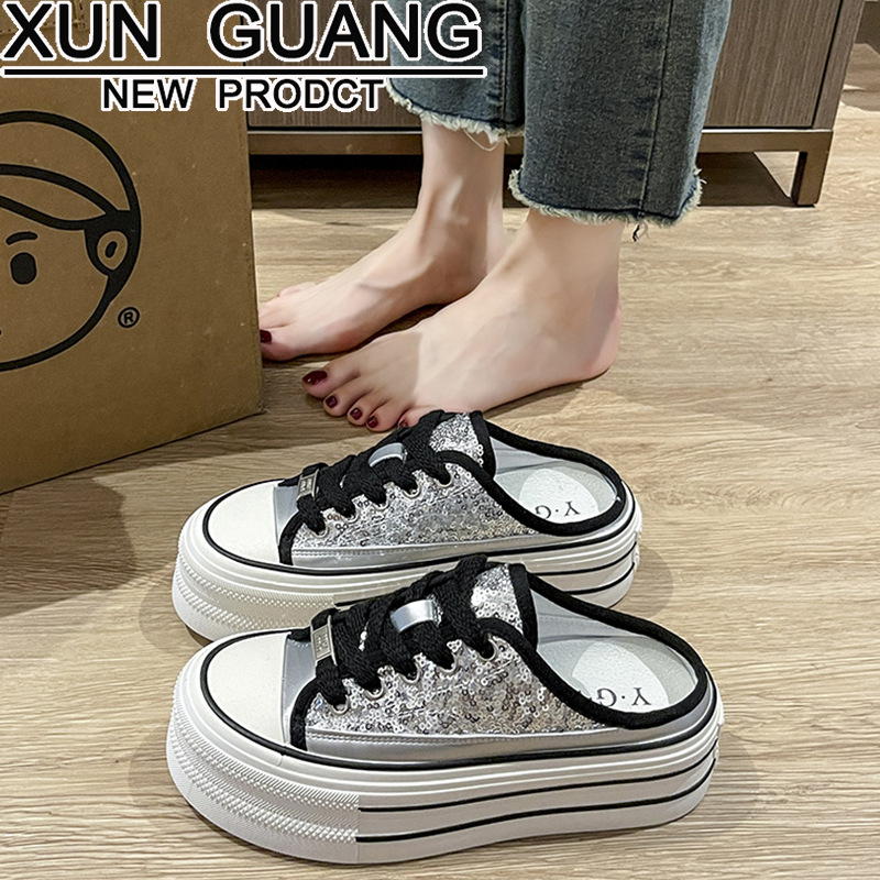 真皮厚底一脚蹬包头半拖鞋女夏季新款百搭休闲无后跟亮片板鞋