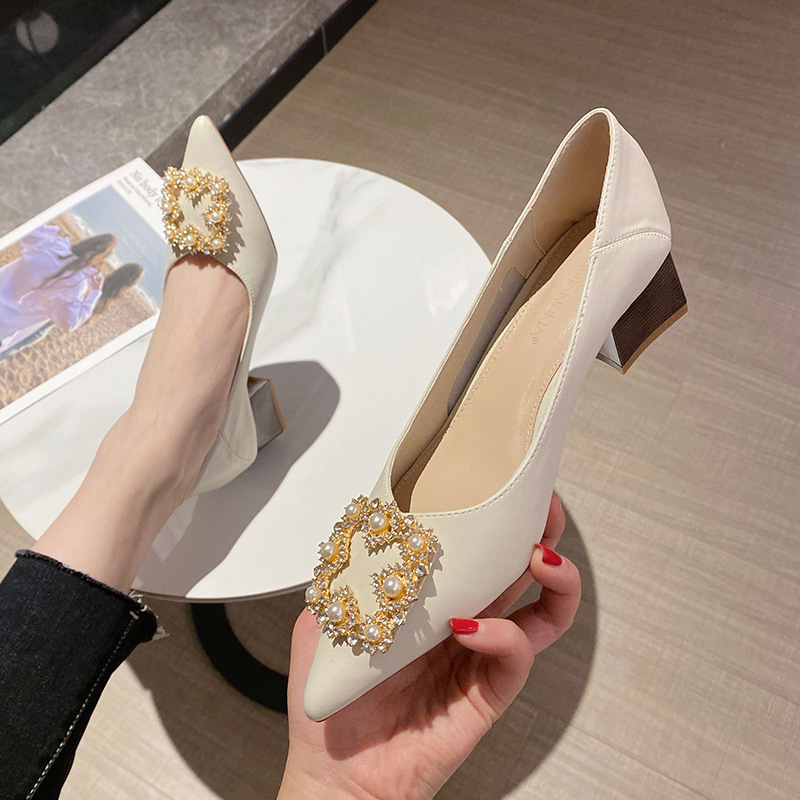真牛皮女单鞋新款浅口中跟时尚扣饰女鞋尖头粗跟高跟鞋女