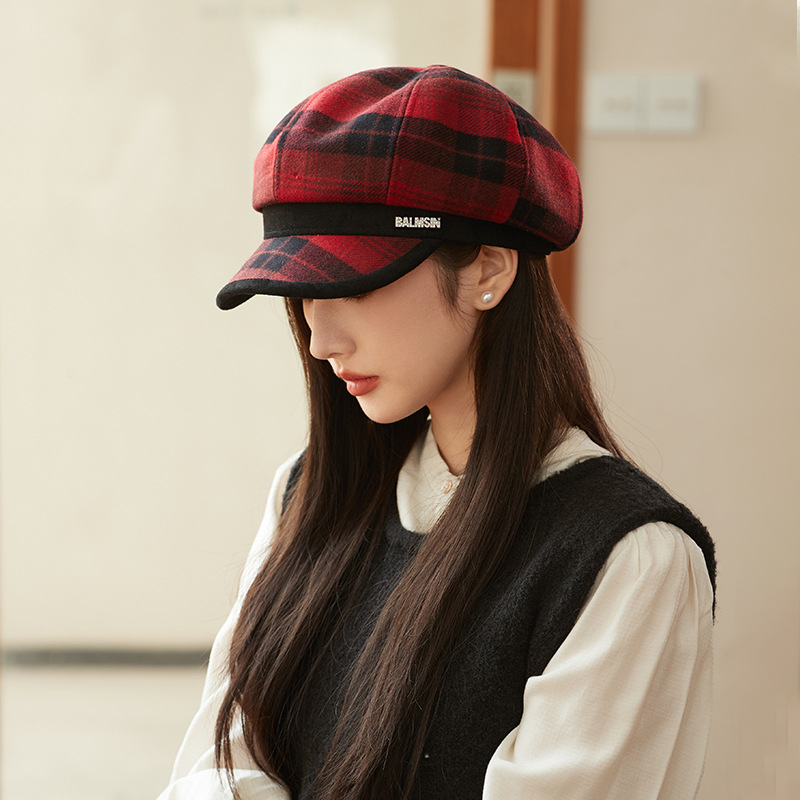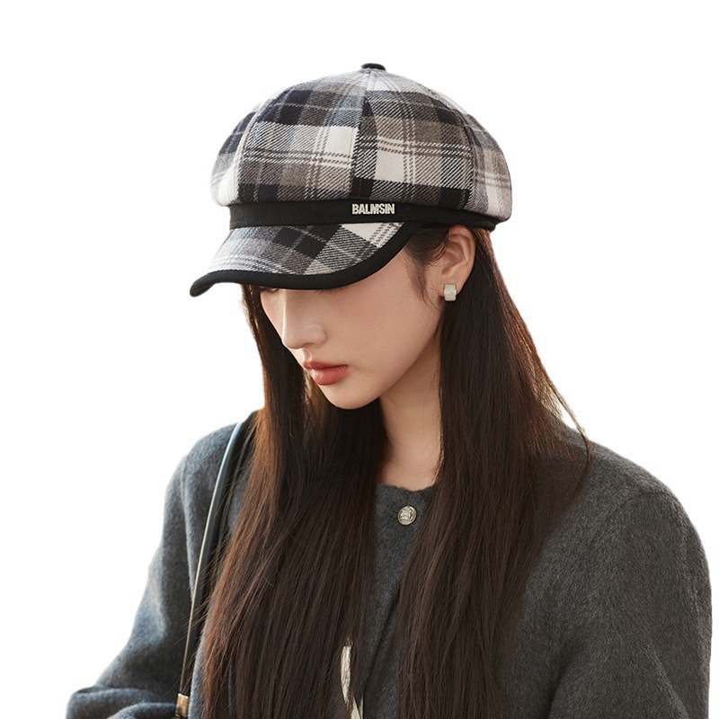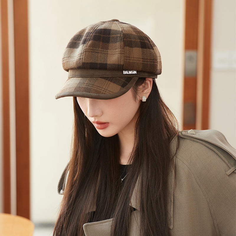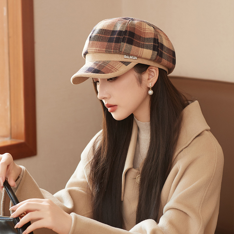 格子八角帽子女款新款时尚百搭格纹显脸小英伦复古贝雷报童帽