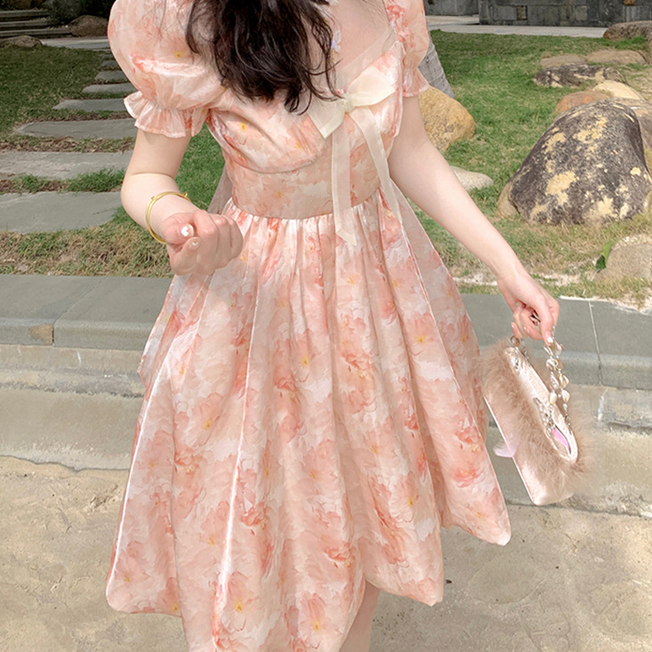 法式连衣裙可甜可盐方领茶歇绝美夏天仙女蓬蓬在逃森系初恋裙