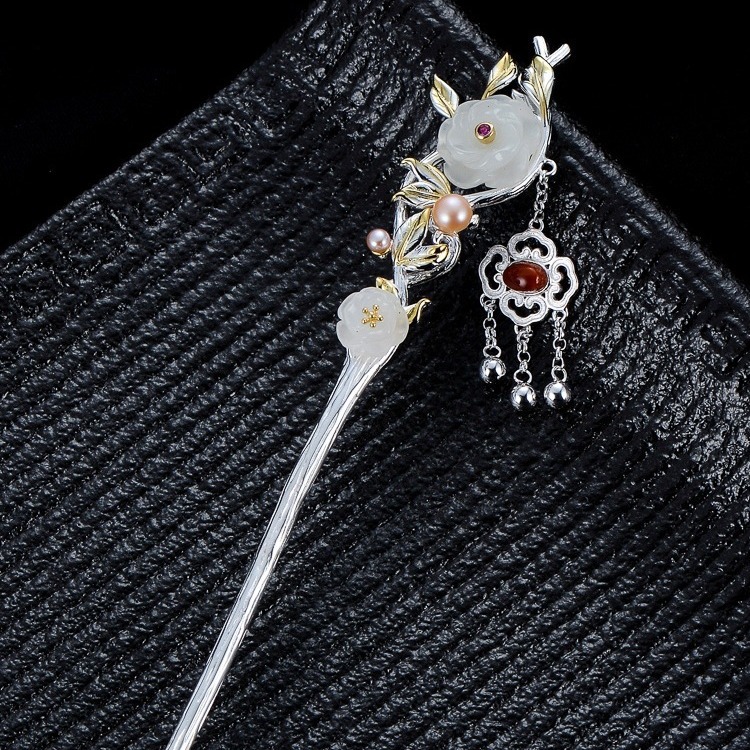 玫瑰古风纯银发簪女和田玉簪子流苏步摇旗袍汉服头饰现代盘发配饰