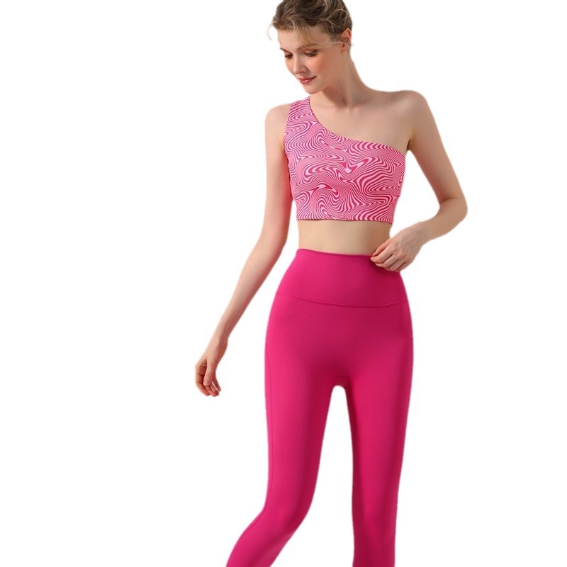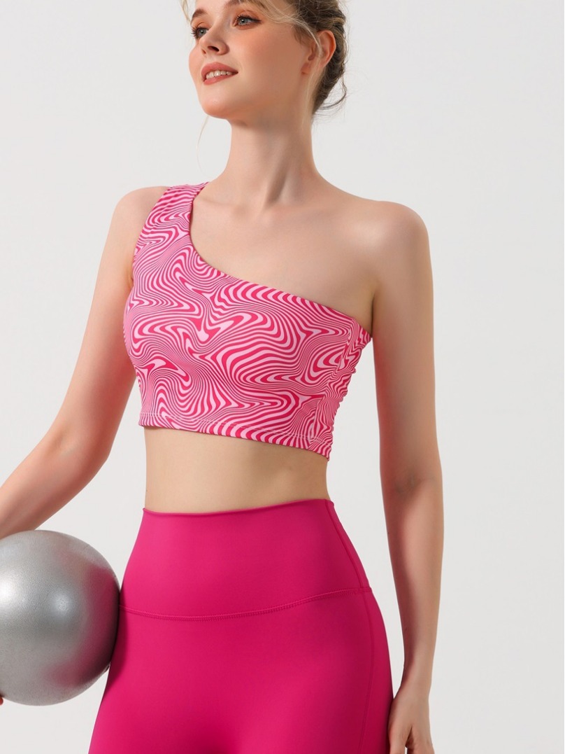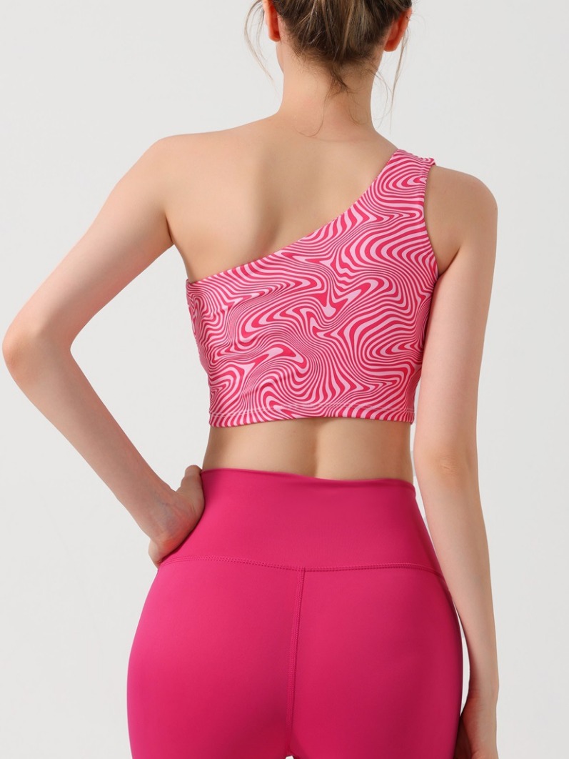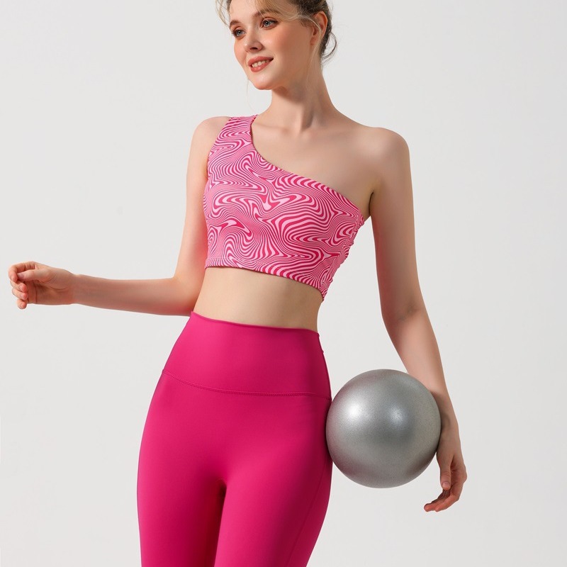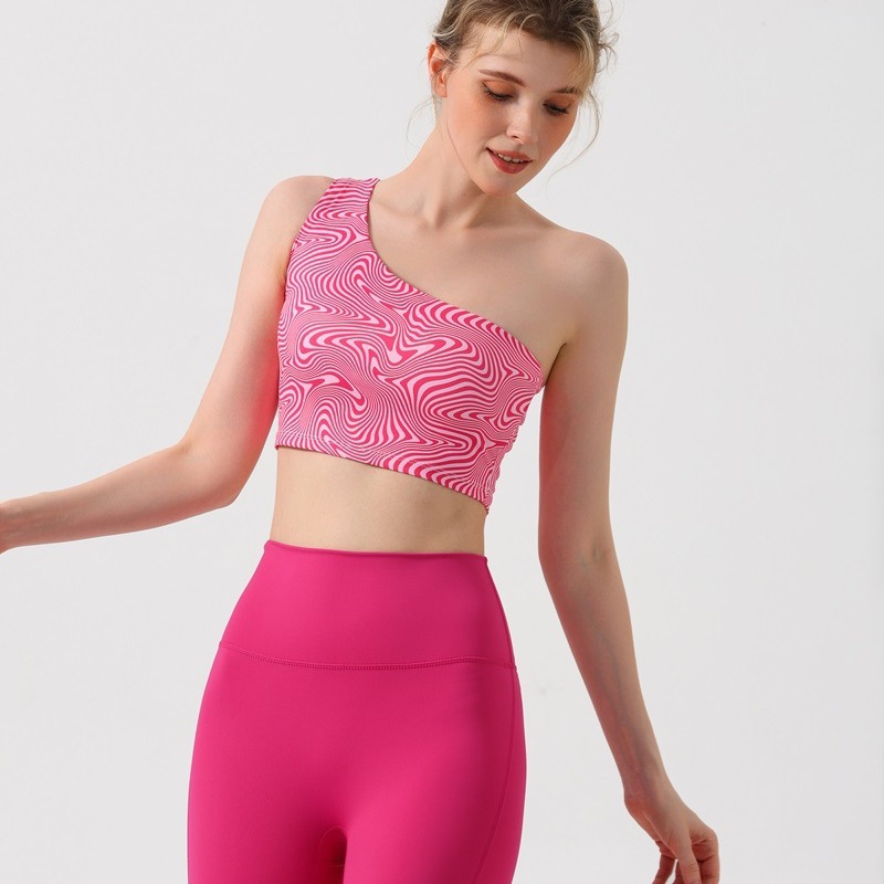 跨境欧美外贸印花背心时尚斜单肩瑜伽服女带胸垫运动文胸健身内衣