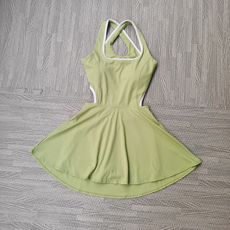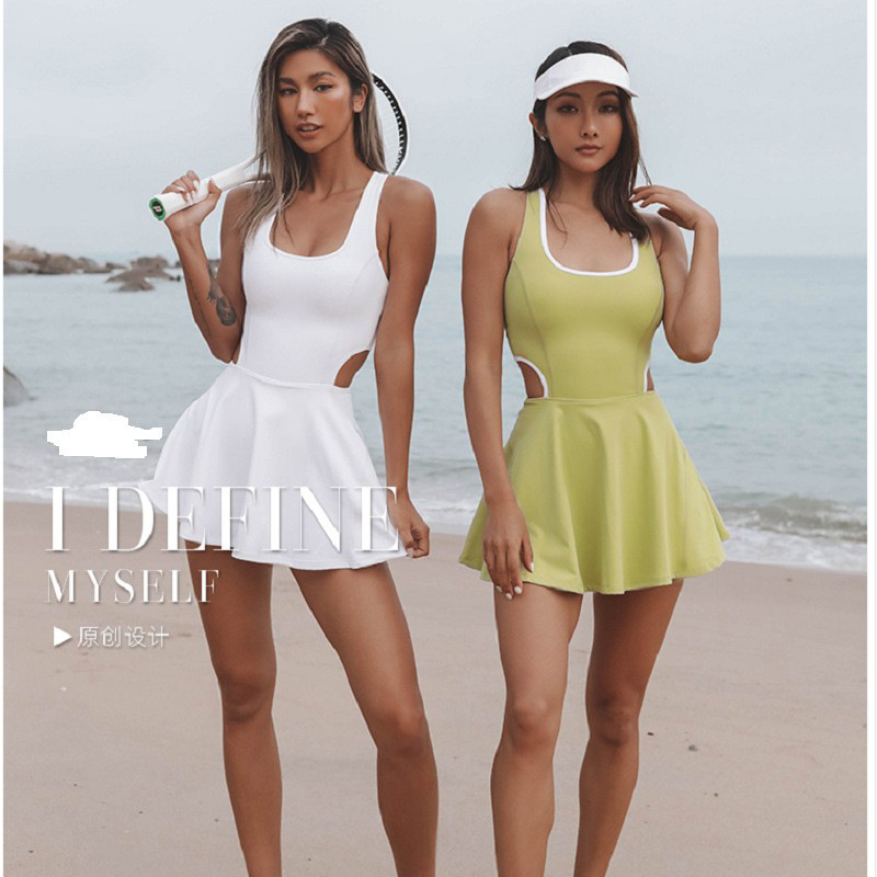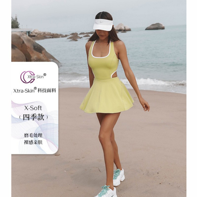 网红性感时尚高端锦纶裸感连体瑜伽服假两件短裙热裤游泳衣紧健身